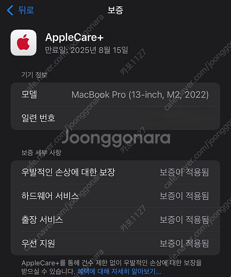※ 카페 상품 게시글은 자동으로 중고나라 앱/사이트에 노출합니다. 노출을 원하지 않으실 경우 고객센터로 문의 바랍니다. ※ 등록한 게시글이 회원의 신고를 받거나 이상거래로 모니터링 될 경우 중고나라 사기통합조회 DB로 수집/활용될 수 있습니다. ─────────────────── 📢 제목에 "제조사/ 브랜드 명"과 "상품명(ex. 맥북 에어 13)”를 넣어 작성하면, 보다 빠른 판매가 가능합니다! 📢 게시글 작성 시 배송 방법에 “직거래”와 “내 위치” 설정할 경우, 보다 빠른 판매가 가능합니다! 👆 오늘 작성가능한 게시글 수가 부족하다면, 상단에 "중고나라 앱 다운받기"를 통해서 앱에서 작성해 보세요! 맥북 프로 M2 13인치 팝니다! 메모리는 24GB에 저장용량 512GB입니다! 칩셋은 M2입니다! 애플 케어 플러스도 2025년 8월 15일까지로 아직 많이 남았습니다! 작업용으로 사서 깨끗하게 쓰고 업그레이드를 위해 판매합니다! 더 궁금하신 내용 있으시면 언제든지 쪽지나 문자 주세요!