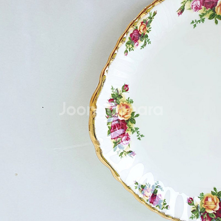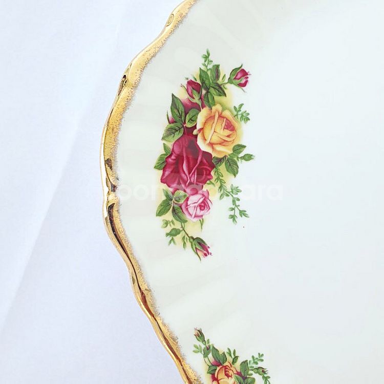 로얄알버트 올드컨트리로즈 황실장미 귀달이 케이크접시에요. 영국에서 2002년 이후에 제작되었으며 펄스트 퀄리티에요. 올드 컨드리 로즈는 세계에서 가장 인기있는 도자기 패턴으로 꼽히고 있어요. 27cm의 사이즈로 다양한 디저트, 과일을 올려놓기 좋아요. 전체적으로 우수한 상태에요. 크기 27cm x 24cm