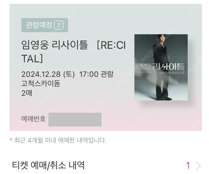 ※ 카페 상품 게시글은 자동으로 중고나라 앱/사이트에 노출합니다. 노출을 원하지 않으실 경우 고객센터로 문의 바랍니다. ※ 등록한 게시글이 회원의 신고를 받거나 이상거래로 모니터링 될 경우 중고나라 사기통합조회 DB로 수집/활용될 수 있습니다. ─────────────────── 임영웅 리사이틀 콘서트 12/28(토) 17시 공연 408구역 2연석 판매합니다. 2매 30만원 입금확인 후 배송지변경으로 양도드려요!
