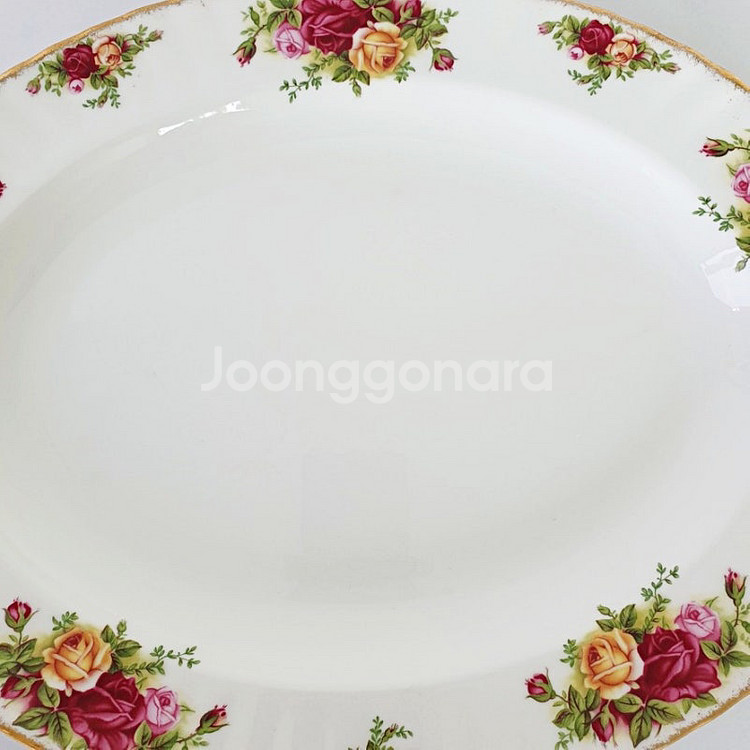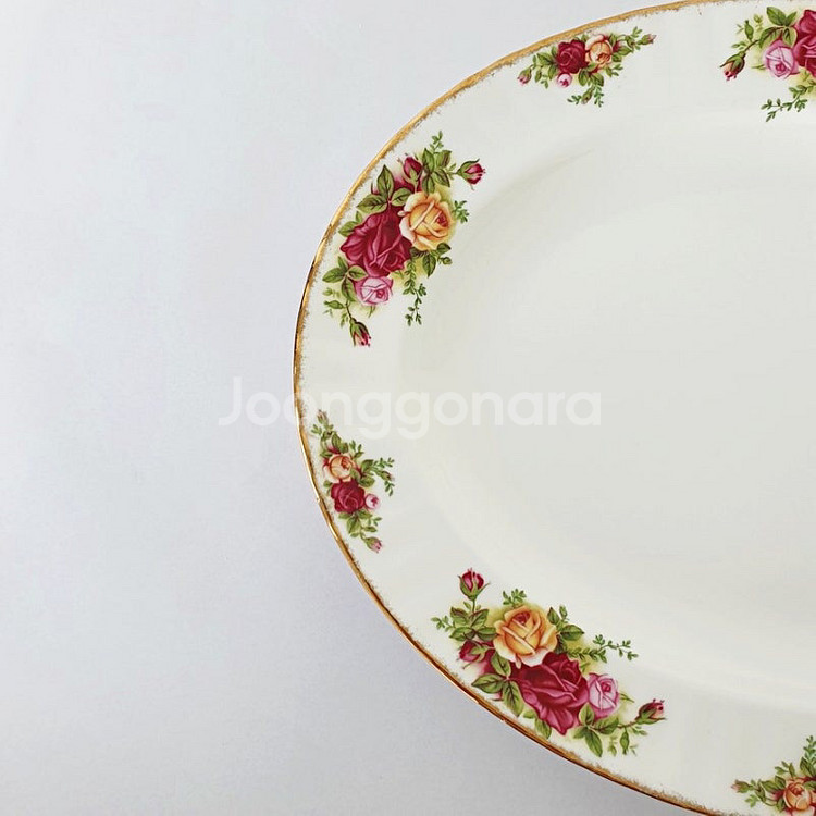 로얄알버트 올드컨트리로즈 황실장미 오벌 접시 35cm에요. 1980년~1993년 사이 영국에서 제작되었으며 펄스트 퀄리티에요. 올드 컨드리 로즈는 세계에서 가장 많이 판매되는 디너웨어 패턴으로 버던디, 핑크, 옐로우 장미의 시그니처 모티브와 반짝이는 골드 밴딩으로 포인트를 주었어요. 전체적으로 우수한 상태에요. 크기 35cm x 27cm