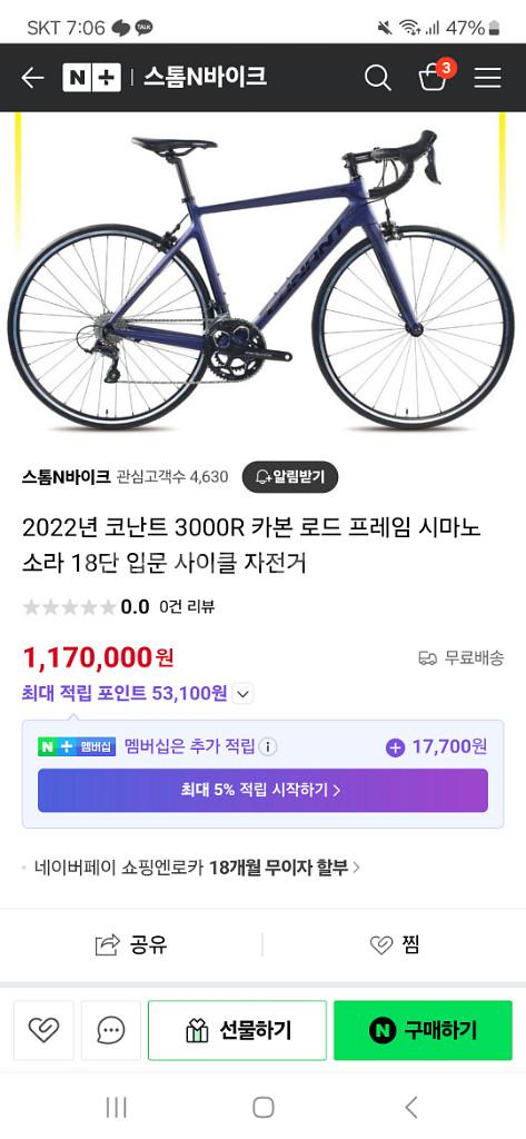 제품명: 코난트 3000R 소라 18단 프레임: 풀카본 포크: 풀카본 싯포스트: 순정 싯포스트 사이즈: 510(L) 안장: 듣보 카본 안장 페달: 경량 평페달 핸들바: 풀카본 에어로 드롭바 직거래만 받습니다. 최근에 샵에서 전체적인 정비도 받았습니다. 바로 타시면 될것같습니다. 실물로 보시면 무광 블랙이 정말 이쁩니다. 밟으면 진짜 잘나가요. 하자는 눈에 보이지않는 미세한 기스밖에 없습니다. 핸들바가 넓어서 손 얹고 타면 편합니다^^