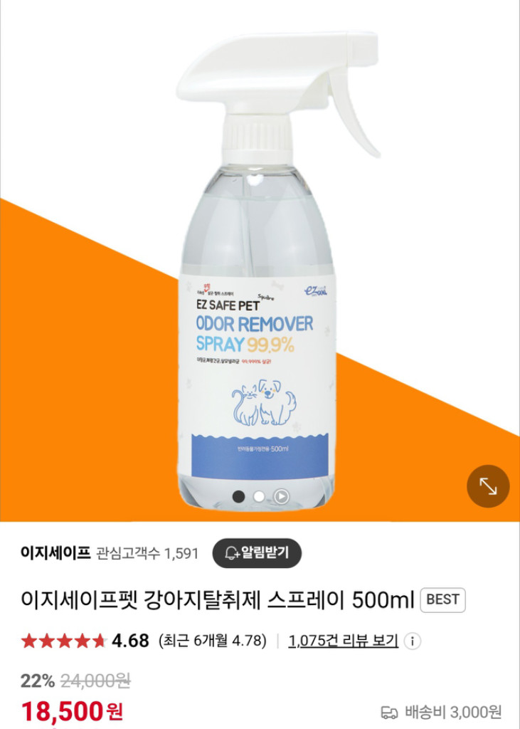 펫박람회에서 매회 매진되는 비자극 무향 살균탈취제 입니다. 효과는 아주 좋습니다. 인터넷에서 평만 봐도 아실거에요 :) 500ml + 300ml 세트 : 25,500원 인터넷가 500ml : 18,500원 인터넷가 300ml : 13,000원