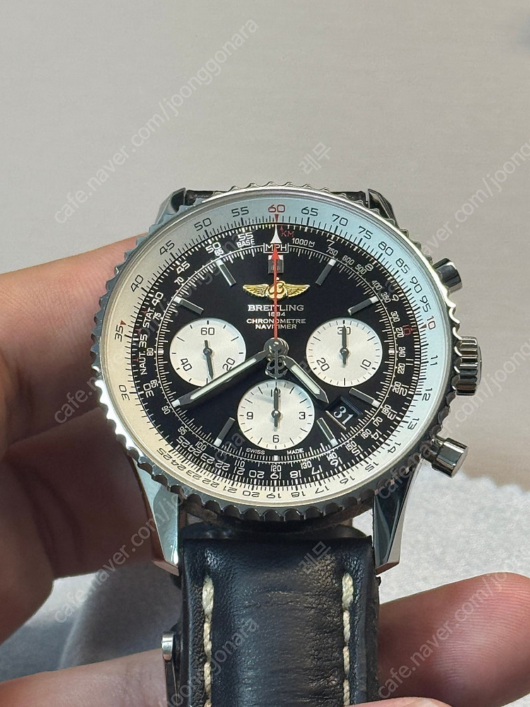 스탬핑일자 : 15년 7월 18일(해외) 오버홀 : 22년 2월 21일(정식오버홀, 롯데월드타워점) 구성품 : 풀셋 상태 : 세월에따른 실기스 있음(폴리싱 X) 직거래장소 : 강동/하남/을지로 네비타이머 중 디자인적으로 가장 선호도가 높은 황금날개 로고 43mm 네비타이머 입니다. 몇가지 시계를 돌려가며 차고 있어서 한달에 1주일정도 찼으며, 폴리싱을 하지 않아 실기스는 있지만 상태 양호한 편입니다. 연락 주십시오.