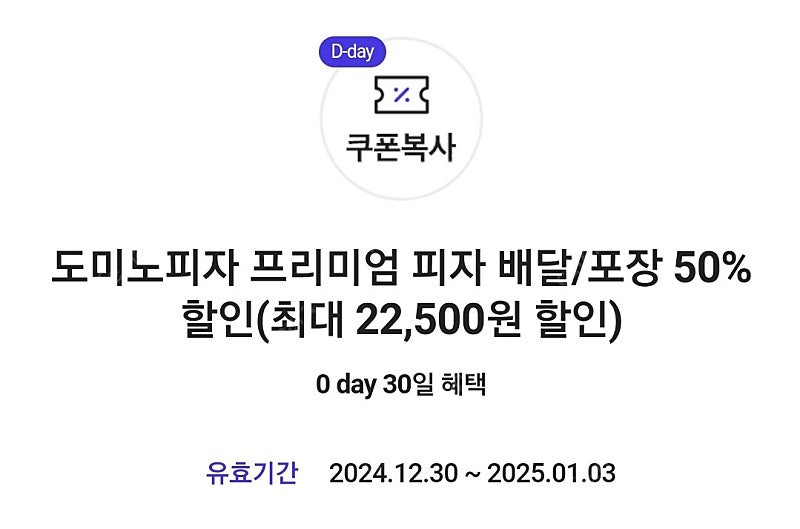 ※ 카페 상품 게시글은 자동으로 중고나라 앱/사이트에 노출합니다. 노출을 원하지 않으실 경우 고객센터로 문의 바랍니다. ※ 등록한 게시글이 회원의 신고를 받거나 이상거래로 모니터링 될 경우 중고나라 사기통합조회 DB로 수집/활용될 수 있습니다. ─────────────────── 📢 제목에 "제조사/ 브랜드 명"과 "티켓명(ex. 스타벅스 아메리카노 Tall) ”을 넣어 작성하면, 보다 빠른 판매가 가능합니다! 📢 게시글 작성 시 배송 방법에 “직거래”와 “내 위치” 설정할 경우, 보다 빠른 판매가 가능합니다! 👆 오늘 작성가능한 게시글 수가 부족하다면, 상단에 "중고나라 앱 다운받기"를 통해서 앱에서 작성해 보세요! 안심번호로 연락주세요 채팅으로 연락주셔도 됩니다 유효기간 1/3일까지 2000원 1장 있어요 미진행 매장 리스트 고양점, 구파발점, 길동점, 당산점, 대구효목점, 대방점, 대전도안점, 봉담점, 부여점, 시흥목감점, 시흥연성점, 양구점, 완주점, 울산온산점, 원주혁신점, 홍천점, 화곡점 특수 매장 : 대명비발디파크점, 롯데월드점, 알펜시아점, 잠실야구장점 프리미엄 피자(M,L)배달/포장 주문 시 50%할인(함께 주문하는 사이드디시,콜라,소스,토핑도 할인 적용) *하프앤하프,클래식 피자,마이키친,인기 세트 메뉴,해피 데일리 등 다른 메뉴에는 혜택이 적용되지 않습니다. *도미노피자 홈페이지/앱에서 배달/포장 주문 시 사용하실 수 있습니다.(전화/매장 방문 주문 시에는 쿠폰이 적용되지 않습니다.) *피자 1판만 할인받으실 수 있습니다.(피자 2판 이상 주문 시 0 day 할인이 적용되지 않습니다.) 정가 기준 45,000원까지 주문하실 수 있으며,최대 할인 금액은 22,500원입니다. *정가 기준 배달은 30,000원 이상/포장은 25,000원 이상 주문하면 할인받으실 수 있습니다. *배달비는 주문 금액에 포함되지 않습니다.(배달비 적용 전 주문 금액이 정가 기준 30,000원 이상이면 할인받으실 수 있습니다.) *배달 주문 시 배달비 3,000원을 부담하셔야 합니다.배달비는 할인이 적용되지 않습니다. *이벤트 제외 매장을 확인해 주시기 바랍니다
