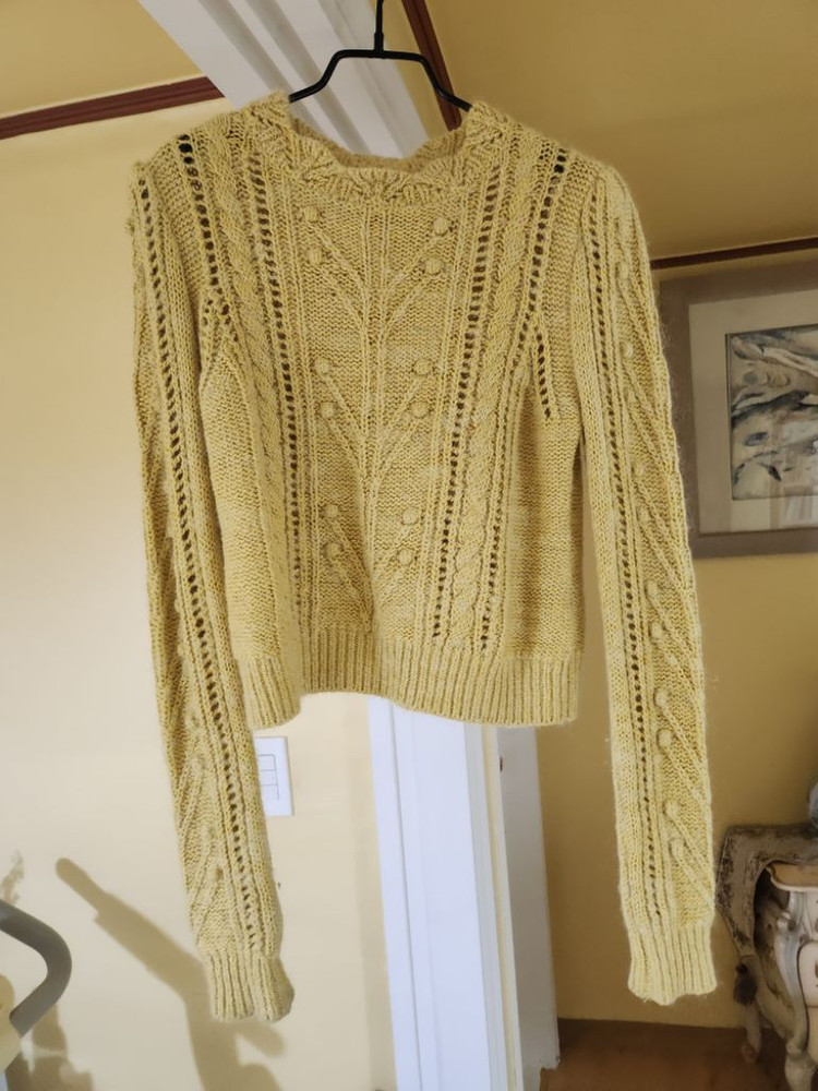 노랑과 겨자색이섞인듯한 차분한옐로우색상 레이스디자인의니트로 과하지않은정도의 퍼프디자인이에요 싸이즈작게나와55~66싸이즈에요