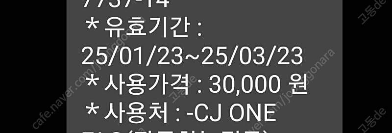 유효기간 250323 이예요 카페 상품 게시글은 자동으로 중고나라 앱/사이트에 노출합니다. 노출을 원하지 않으실 경우 고객센터로 문의 바랍니다. ※ 등록한 게시글이 회원의 신고를 받거나 이상거래로 모니터링 될 경우 중고나라 사기통합조회 DB로 수집/활용될 수 있습니다. ─────────────────── 📢 제목에 "제조사/ 브랜드 명"과 "티켓명(ex. 스타벅스 아메리카노 Tall) ”을 넣어 작성하면, 보다 빠른 판매가 가능합니다! 📢 게시글 작성 시 배송 방법에 “직거래”와 “내 위치” 설정할 경우, 보다 빠른 판매가 가능합니다! 👆 오늘 작성가능한 게시글 수가 부족하다면, 상단에 "중고나라 앱 다운받기"를 통해서 앱에서 작성해 보세요!