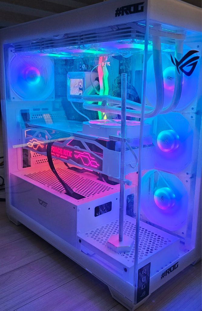 라이젠7 7800X3D B650M MSI PRO + WIFI DDR5 32GB (6000mhz) 델타 32GB (T-FORCE) 화이트 삼성 980 프로OEM 버전 ( NVME M.2 SSD 1TB) 삼성 갤럭시스타 샤인 G360 일체형 2.4인치 IPS 화면 수냉쿨러 파워 : 잘만 TERAMAX GOLD 1000W (PCI 5.0 케이블O) 케이스 : 다크플래쉬 화이트 케이스 이렇게 4개월정도 사용한본체에 최근 구입한 RTX4080S 장착했습니다 (구매 2주 ,당근서 미개봉구입 : 제품명 갤럭시 RTX4080S SUPER SG 화이트) 윈도우도 설치되어있습니다 바로선만 연결하시면됩니다.