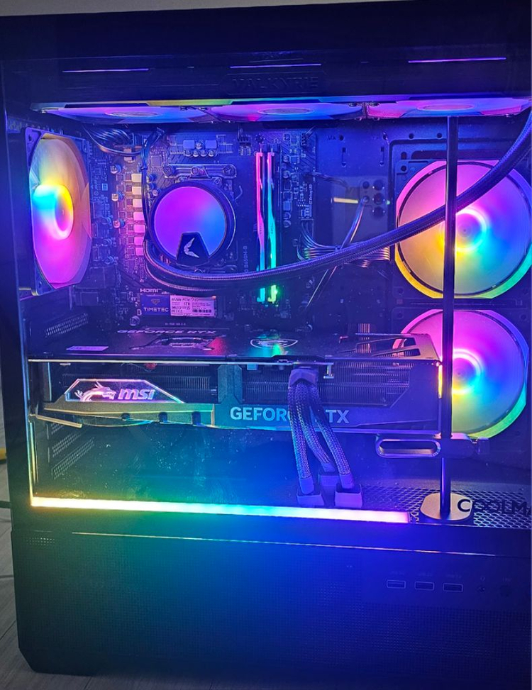 조립후 실사용없습니다 라이젠7 7800X3D B650M PRO MSI DDR5 6000 GSKILL 지스킬 32GB RGB NVME 1TB TIMETEC SSD 지포스 MSI RTX4080S SUPER 16GB 게이밍슬림 FSP 80PLUS GOLD 850W 모듈러 정격파워 (등급골드) COOXMAX 블랙 어항케이스 + 하단LEDBAR 360 발키리 RGB CPU 쿨러 윈도우10/11 PRO 보드귀속 정품인증 판매가 310만원 , 수원,동탄 직거래 가능합니다