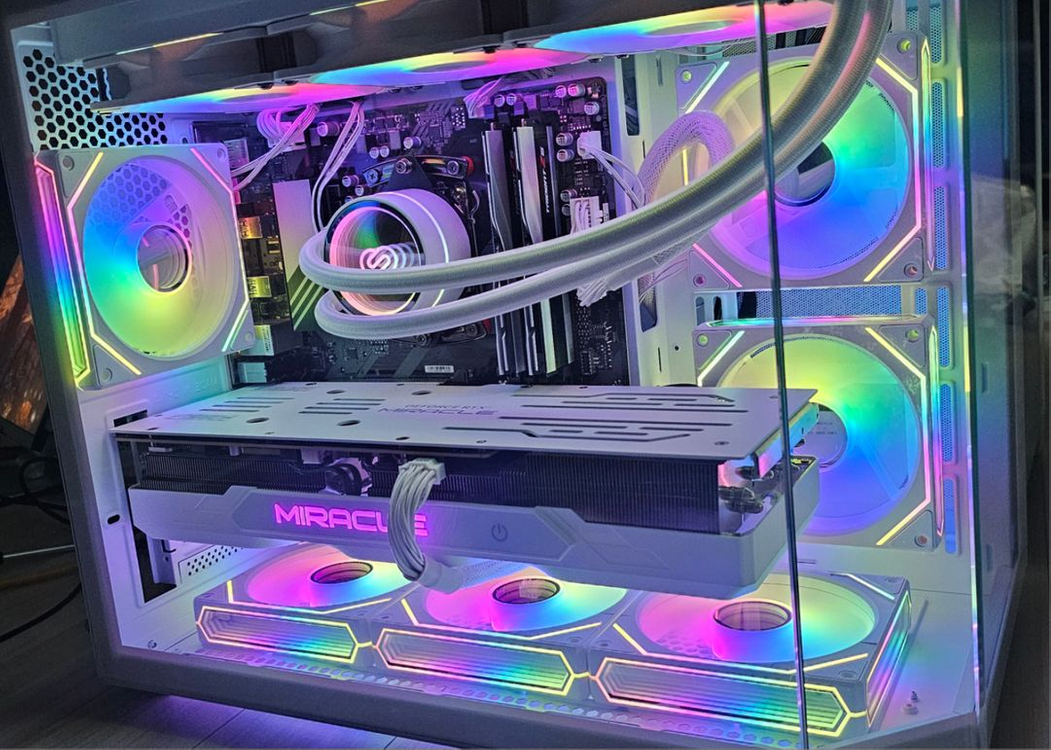 조립후 미사용입니다 라이젠7 7800X3D B650M-K 기가바이트 DDR5 6400MHZ GSKILL 지스킬 32GB 마이크론 P3 PLUS 1TB SSD 지포스 이엠텍 RTX4080S SUPER 16GB 이엠텍 미라클 데이븐 어항케이스 화이트 (준 미니 , 미들타워 작아요) 엔티스 풀모듈러 GOLD PCI 5.0 케이블 1000W 화이트 파워 OS 윈도우11 설치, 튜닝팬 6개 추가장착 3R SYS 360 CPU 쿨러 화이트 요렇게 구성되어있습니다 먼지하나없습니다~