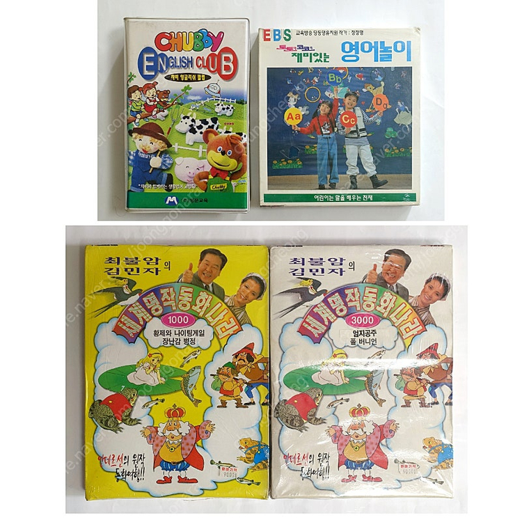 옛날 비디오테이프 일괄 세트 낱개 구매시엔 옆에 각 가격 적어뒀습니다. 1. 챠비 잉글리쉬 클럽 ( 미개봉 ) - 4천원 - 2. 토토와 코코의 재미있는 영어놀이 (2tape, 새것, 흰색) - 5천원 - 3. 최불암 김민자의 세계명작동화나라 1000, 3000 (총 4tape, 밀봉 새제품 ) - 9천원 - 각 박스마다 2tape씩 들어 있어요 황제와 나이팅게일 , 장난감 병정 엄지공주 , 폴 버니언 오래 되어서 외관 빛도 바랬고 비닐 일부 뜯어진 부분들도 있으니 사진확인하시고, 더 상세히 필요하시면 문의주세요.