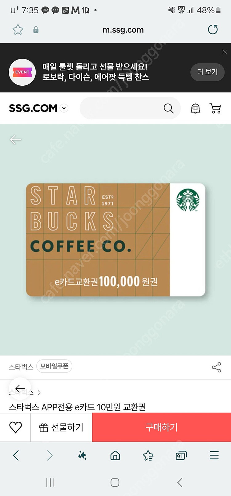 ※ 카페 상품 게시글은 자동으로 중고나라 앱/사이트에 노출합니다. 노출을 원하지 않으실 경우 고객센터로 문의 바랍니다. ※ 등록한 게시글이 회원의 신고를 받거나 이상거래로 모니터링 될 경우 중고나라 사기통합조회 DB로 수집/활용될 수 있습니다. ※ 게시글 내 외부 링크(타 플랫폼 주소, 카카오 오픈채팅 주소 등)을 등록하는 경우, 게시글 삭제 및 서비스 활동 제한 조치를 받을 수 있습니다. 👆 오늘 작성가능한 게시글 수가 부족하다면, 상단에 "중고나라 앱 다운받기"를 통해서 앱에서 작성해 보세요! ─────────────────── 📢 제목에 "제조사/ 브랜드 명"과 "티켓명(ex. 스타벅스 아메리카노 Tall) ”을 넣어 작성하면, 보다 빠른 판매가 가능합니다! 📢 게시글 작성 시 배송 방법에 “직거래”와 “내 위치” 설정할 경우, 보다 빠른 판매가 가능합니다! 🚨회원님의 거래 게시글을 노린 중고나라 운영진 사칭 피싱 사이트를 주의하세요🚨 안녕하세요 스타벅스 e gift card 팝니다.