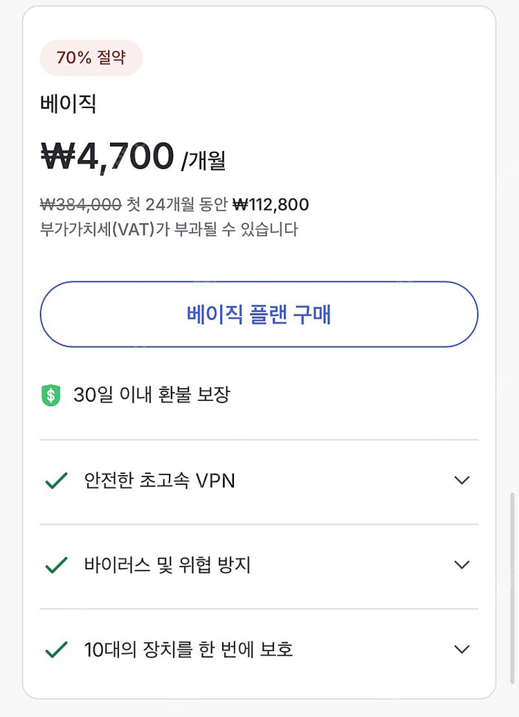 노드 vpn 24개월 베이직 플랜권 사용자 구합니다. 구매하시면 계정과 비번 같이 알려드리니 로그인해서 사용하시면 됩니다. 가격은 기기 당 가격입니다. 다만 두 대 이상 구매하시면 5천 원 할인해 드립니다 예시) 기기 한 대에 vpn 이용 시 25000원 기기 두 대 이용 시 25000x2-5000= 45000원 구매 후 이용 중 본인이 구매한 기기 수를 넘어서 사용하시면 즉시 비밀번호 바꿀 예정이니 이점 주의 부탁드립니다. 이용 원하시면 채팅 부탁드립니다.