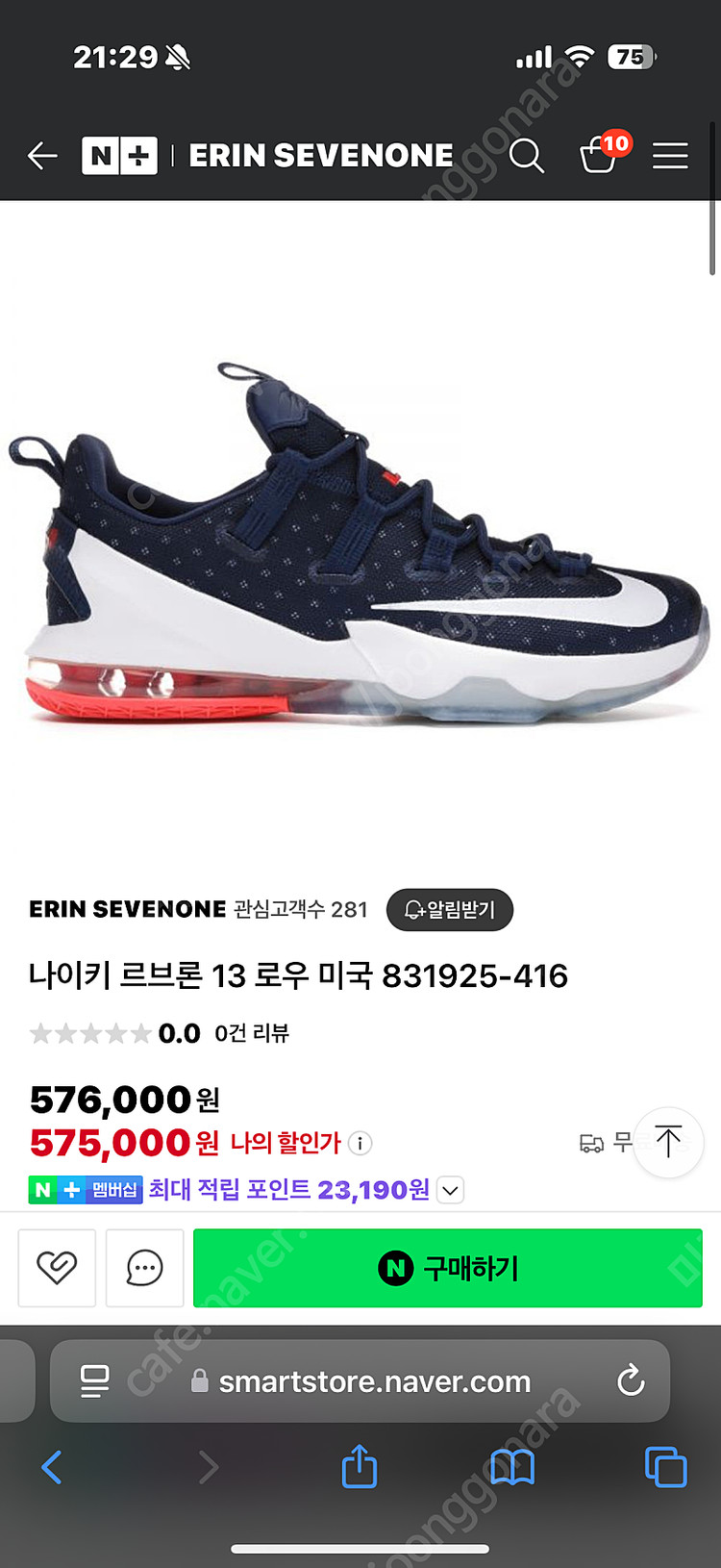 지금은 구할 수 없는 르브론 13입니다. 사이즈: 280 상태: 1회 착용으로 상태 매우 좋아요 박스없고 신발 단품입니다.