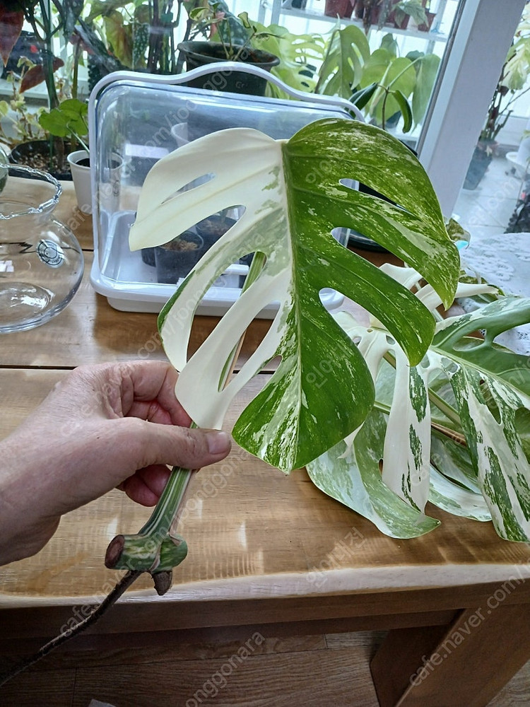 몬스테라알보 무천이 방금잘랐어요 엄청예쁘죠 물꽃이 해서 잔뿌리 좀받아 식재해주심 좋을듯해요 잎사이즈 22. 눈자리 좋고 반반산반 무늬 가격 35000 우체국 택비 5천 있어요 문자가 빨라요