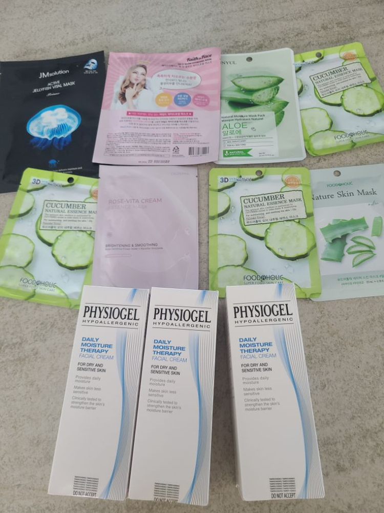 피지오겔 페이셜크림 150ml 3개와 마스크팩 8장 다포함에서 택포 48000원입니다 유통기한 2027년 10월입니다 마스크팩은 랜덤입니다
