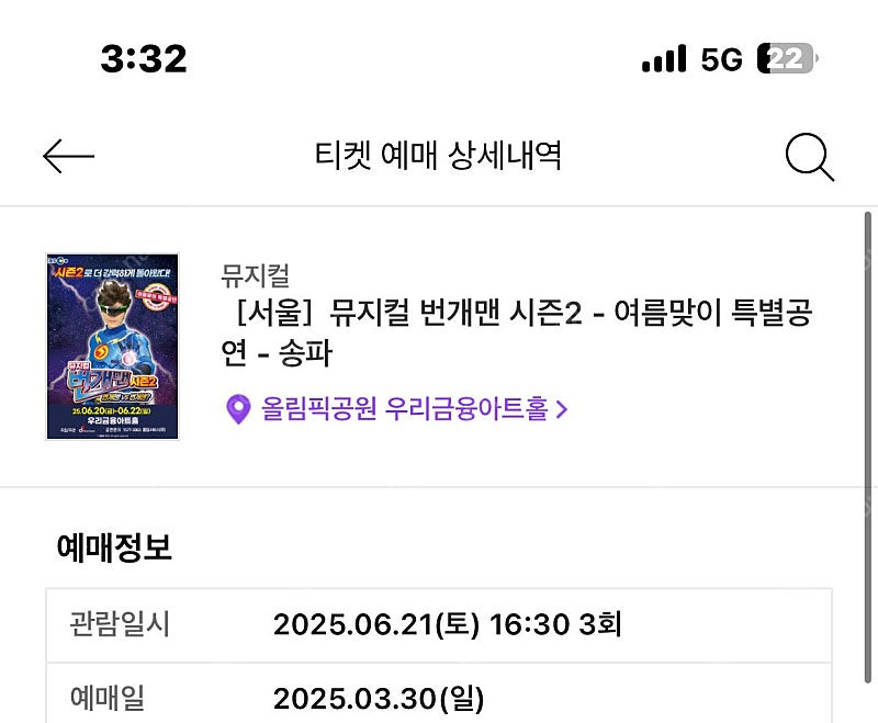 📢 제목에 "제조사/ 브랜드 명"과 "티켓명(ex. 스타벅스 아메리카노 Tall) ”을 넣어 작성하면, 보다 빠른 판매가 가능합니다! 📢 게시글 작성 시 배송 방법에 “직거래”와 “내 위치” 설정할 경우, 보다 빠른 판매가 가능합니다! 📢 내가 가진 커피, 편의점 e쿠폰을 <J쿠폰>에서 간편하고 빠르게 판매가 가능합니다! 2일 이내 판매금을 정산 받아보세요. 6월21일 번개맨 뮤지컬 송파공연 양도해요:) 예약 일찍했는데 ㅠ 이날 일정이 생겨서 ㅠ 수수료 아깝기도 하고 자리 너무 좋아 수수료 포함 제가 산 가격 그대로 양도합니다 자리는 잘보이는 앞자리 통로자리 총3자리입니다 🚨회원님의 거래 게시글을 노린 중고나라 운영진 사칭 피싱 사이트를 주의하세요🚨
