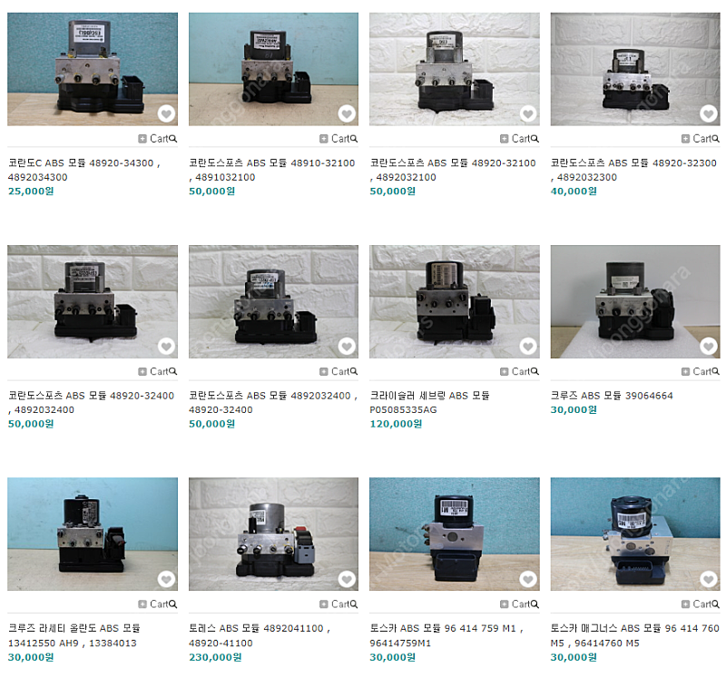 안녕하세요 수입차 국산차 순정 중고 VDC ABS 브레이크 모듈 전문 중고부품 전문 준준모터스 입니다. 하이드로릭 유니트 어셈블리 , HYDRAULIC UNIT ASSY , VDC 순정 모듈 유니트 자동차 중고부품 전문 입니다. 상품 구매전 부품번호 호환여부 확인 후 문의 바랍니다. 현대 기아 KG모빌리티 르노 GM 쉐보레 코란도C ABS 모듈 품번 : 48920-34300 , 4892034300 25,000 원 코란도C ABS 모듈 48920-34300 , 4892034300 코란도스포츠 ABS 모듈 품번 : 4891*-***** , *****32100 5만원 코란도스포츠 ABS 모듈 4891*-***** , *****32100 코란도스포츠 ABS 모듈 품번 : 4892*-***** , *****32100 5만원 코란도스포츠 ABS 모듈 4892*-***** , *****32100 코란도스포츠 ABS 모듈 품번 : 4892*-***** , *****32300 4만원 코란도스포츠 ABS 모듈 4892*-***** , *****32300 코란도스포츠 ABS 모듈 품번 : 4892*-***** , *****32400 5만원 코란도스포츠 ABS 모듈 4892*-***** , *****32400 코란도스포츠 ABS 모듈 품번 : 4892****** , *****-32400 5만원 코란도스포츠 ABS 모듈 4892****** , *****-32400 크라이슬러 세브링 ABS 모듈 품번 : P05085335 AG , P05085335AG 12만원 크라이슬러 세브링 ABS 모듈 P05085335AG 크루즈 ABS 모듈 품번 : 39064664 3만원 크루즈 ABS 모듈 39064664 크루즈 라세티 올란도 ABS 모듈 품번 : 13412550 AH9 3만원 크루즈 라세티 올란도 ABS 모듈 13412550 AH9 , 13384013 토레스 ABS 모듈 품번 : 4892****** , *****-41100 23만원 토레스 ABS 모듈 4892****** , *****-41100 토스카 ABS 모듈 품번 : 96 414 759 M1 , 96414759M1 3만원 토스카 ABS 모듈 96 414 759 M1 , 96414759M1 토스카 매그너스 ABS 모듈 품번 : 96 414 760 M5 , 96414760 M5 3만원 토스카 매그너스 ABS 모듈 96 414 760 M5 , 96414760 M5 옵션 추가 혹은 제품 상태에 따라 가격은 변동 될 수 있으며 , 정확한 가격 상품 문의는 전화 문의 바랍니다. 진단 및 수리 장착은 하지 않습니다. 판매만 합니다 상품 명 부품번호 꼭!!!! 확인해주세요. 다른 상품 부품이 필요하시면 전화문의 부탁드립니다. 직거래 화성 지역만 가능 합니다. 택배 , 퀵 (배송비별도) 거래 가능 합니다. 택배 배송은 파손면책 동의! 필수 입니다. 제품 상태 가격 정보 다른 부품을 찾고 있으면 네이버 검색 창 준준모터스 검색해 주세요~ ▽▽▼▼▽▽ https://imim.kr/product/list.html?cate_no=55&sort_method=1&page=37 문의 : ***-****-**** 자동차 중고부품은 특성상 생활기스는 있습니다. 받으신 상품이 불량일 경우 7일 이내 동일 상품으로 교환으로 먼저 진행 합니다. 테스트용 , 개조작업 , 단순변심 , 진단오류 , 스티커 훼손 , 부품번호 미확인 주문 , 포장개봉은 반품 불가 할수 있습니다. 댓글 확인 답변은 어렵습니다. 문자 카톡 유선 문의 주세요. 감사합니다. ( 준준모터스 )상품 정보 내 개인정보는 자동 보호됩니다. 안심결제로 안전하게 거래하세요.