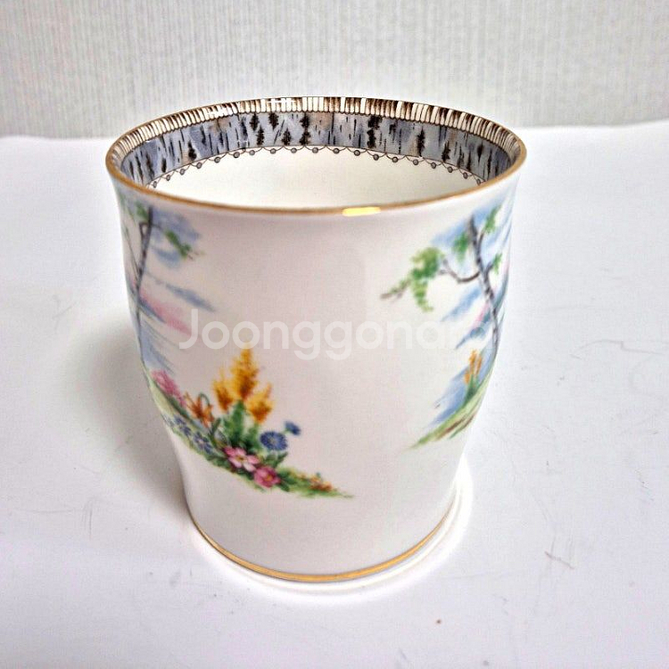 로얄 알버트 실버 버치 커피잔이에요. 영국에서 파인 본 차이나 제작되었으며 햄튼 쉐이프입니다. 실버 버치 패턴은 1930년대부터 2001년까지 제작된 현재는 단종된 패턴으로 안개가 자욱한 호수가 내려다 보이는 영국 시골의 모습으로 봄 다년생 식물과 함께 아름다운 백 자작나무 숲의 모습이 특징인 패턴이에요. 전체적으로 깨끗한 상태에요! - 크기 지름 10cm (손잡이 포함) 높이 8cm 가격 1p - 2만 8천원