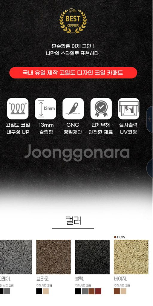 차량전용 최고급 코일매트 판매합니다. ★고밀도 디자인 코일카매트 승용차기준 1대분 8만원입니다 디자인 패턴/색상 안내 - 그레이/브라운/블랙/베이지 - 다이아/클로버/스타/무지/체커 - 베이지는 무지만 가능 - 체커는 그레이만 가능 ★엣지 코일카매트 대비 - 높은 가성비 - 깔끔한 테두리 마감 - 고밀도 내구성 가미 차량 모델 주소 주시면 택배로 보내드리겠습니다 010-9948-5300