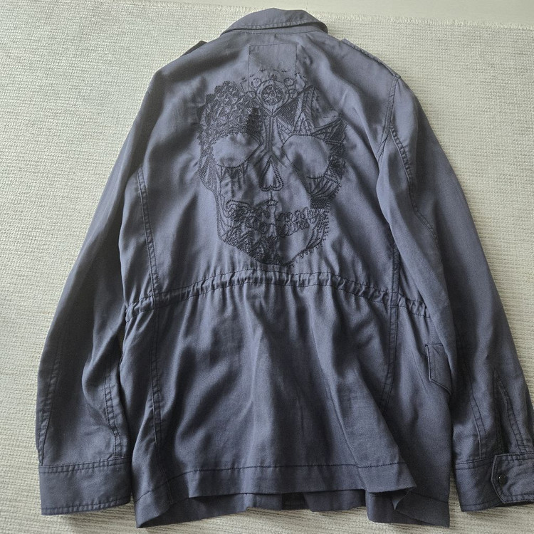 쟈딕앤볼태르 스컬 야상자켓 리오셀100% s사이즈 빈티지한 다크그레이 블루같은 컬러에요! 부드리운 재질이라 스카프랑 내추럴한 핏으로 매칭하기 좋구요 뒤에 스컬포인트가 튀지 않은 자수라 부담이 없습니다.! 빈티지한 스타일 좋아하시분께 추천드립니다.