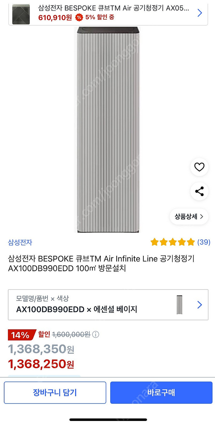 📢 제목에 "제조사/ 브랜드 명"과 "상품명(ex. 3000시리즈 전동 면도기)”을 넣어 작성하면, 보다 빠른 판매가 가능합니다! 📢 게시글 작성 시 배송 방법에 “직거래”와 “내 위치” 설정할 경우, 보다 빠른 판매가 가능합니다! 삼성 BESPOKE 큐브 Air Infinite Line 공기청정기 AX100DB900EDD 모델입니다 1년정도 사용했습니다. 펫케어까지 지원해서 반려동물 있으신 분이 사용하셔도 좋은 제품입니다. 영수증도 드립니다. 사용감 감안하여 저렴하게 판매합니다. 직거래 평택입니다. 🚨회원님의 거래 게시글을 노린 중고나라 운영진 사칭 피싱 사이트를 주의하세요🚨