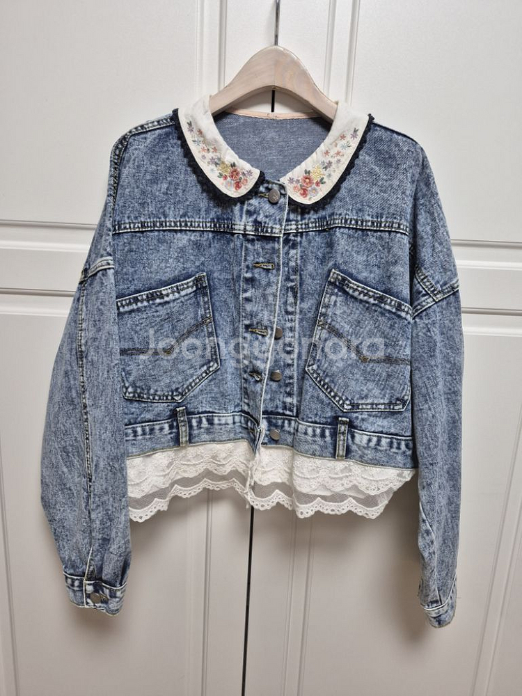 돌청 무늬 빈티지 데님 숏자켓 여유있는 사이즈예요. 카라부분 자수 카라로 새로 달았고,하단 레이스와 허리부분 밴딩 처리했어요. 러블리 느낌으로 원피스에 걸쳐주면 예뻐요. 반품 56센티,총길이 53센티~~ 문의 주세요.