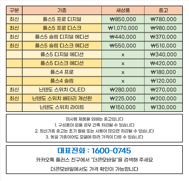 안녕하세요! 더큰모바일입니다 저희는 PS5, PS4, 닌텐도 스위치 중고 제품을 전문으로 매입 및 판매하고 있는 업체입니다. [매입 방식 & 거래 안내] → 택배거래 / 직거래 모두 가능 → 시세에 맞춘 정직한 가격 책정 → 거래 완료 전까지 친절한 상담 보장 문의: [1600-0745] 위치: [서울시 노원구 상계로 93 경일빌딩 3층] 중고 게임기 팔기 전, 시세 확인은 필수! 믿고 거래할 수 있는 중고 게임기 파는곳, 사는곳 네이버에 더큰모바일 검색 또는 https://www.thekunm.com/ 해당 링크에서 지금 바로 확인해보세요 최근에 콘솔 중고 시세가 다시 올라가고 있어서, 이런 분들 꼭 봐주세요!! ▶ 중고 게임기 팔고 싶은데 어디서 팔아야 할지 모를 때 ▶ 닌텐도 스위치 중고 가격이 얼마인지 정확히 알고 싶을 때 ▶ 오래된 플스4를 지금 팔고 새 모델로 업그레이드 하고 싶은 분 ▶ 중고 시세보다 제값 받고 판매하고 싶은 분 중고 게임기 팔기 좋은 시기 놓치지 마세요! 궁금하신 시세/매입가격 친절히 안내드려요. 요즘 닌텐도 스위치 파는곳 사는곳 찾는 분들이 정말 많습니다. 특히 OLED 모델은 품귀라 중고라도 구입하려는 분들이 많아서 매입 가격도 높게 측정하고 있어요! [닌텐도 스위치 시리즈] ● 닌텐도 스위치 OLED 모델 (모델명: HEG-001) ● 닌텐도 스위치 배터리 개선판 (모델명: HAC-001(-01)) ● 닌텐도 스위치 라이트 (모델명: HDH-001) → 닌텐도 스위치 중고 사는곳, 팔기 좋은곳, 시세 비교 가능! → 구성품이 없어도 매입 가능 [플레이스테이션 5 (PS5) 시리즈] ● 플스5 프로 ● 플스5 슬림 디지털 에디션 (모델명: CFI-1218B) ● 플스5 슬림 디스크 에디션 (모델명: CFI-1218A) ● 플스5 디지털 에디션 (모델명: CFI-1218B, CFI-1118B, CFI-101...