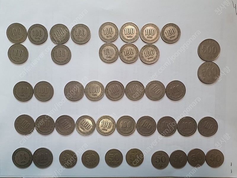 안녕하세요? 각종 희귀동전 및 준희귀동전을 판매코저 글 올립니다. 발행년도, 개당가격, 보류갯수, 사진 표시했습니다. 가격은 동전환전소 보품(마모가 많이 되어 도안이 흐릿해진 상태)기준 최저가 보다 훨씬 저렴하게 책정했습니다. 일부를 제외하고는 대략 미품(세월의 흔적이 있고 마모가 조금됨)이상급 정도는 되는거 같습니다. 시세보다 매우싸게 올렸으니 부담없이 구매하시기 바랍니다. 직거래시 1호선 관악역 2번출구에서 하며, 택배거래시 3500원 추가해주심 선불로 보내드립니다. 반값택배(GS) 시에는 선불 2000원 입니다. 최소 7000원 이상 구매시 거래 진행합니다. 1. 10원 발행년도 개당가격 개수 비고 1966 ₩1,500 1 적동 판매완료 1967 ₩4,000 2 적동 판매완료 1968 ₩2,000 1 판매완료 1970 ₩6,000 1 적동 판매완료 1970 ₩4,000 2 황동 판매완료 1971 ₩200 5 판매완료 1972 ₩1,000 4 판매완료 1979 ₩1,000 6 판매완료 1980 ₩500 2 1982 ₩800 1 2. 100원 발행년도 개당가격 개수 비고 1971 ₩5,000 1 판매완료 1982 ₩4,000 3 1973 ₩1,000 6 1974 ₩500 5 1975 ₩1,000 8 1977 ₩5,000 4 1978 ₩4,000 7 1979 ₩3,000 16 1980 ₩3,000 8 1985 ₩3,000 1 3. 500원 발행년도 개당가격 개수 비고 1982 ₩5,000 1 판매완료 1984 ₩5,000 2 1988 ₩2,000 1 1989 ₩3,000 2 4. 50원 모두 판매완료 발행년도 개당가격 개수 비고 1973 500 1 1974 ₩700 1 1978 ₩600 3 1980 500 1 1982 500 4 1983 200 1 5. 5원 모두 판매완료 6. 1원 모두 판매완료 7. 외국 주화 : 일괄 7,000원 모두 판매완료 8. 행운의 2달러 (보관만 해둔 미사용품) : 3,000원 판매완료