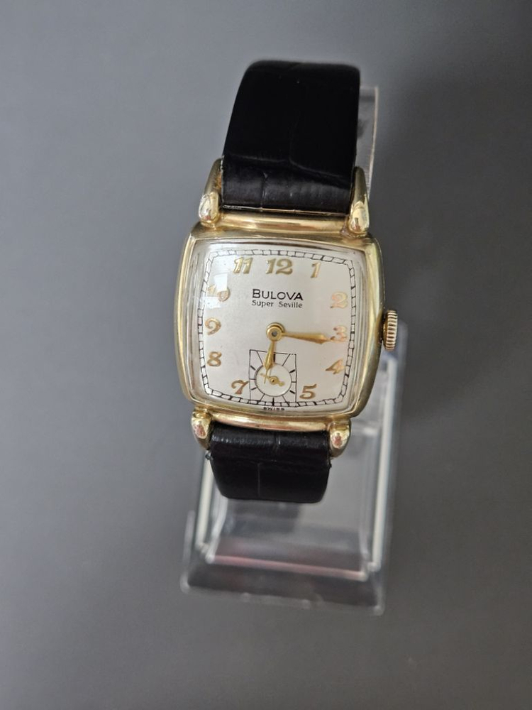 빈티지 Bulova 수퍼세빌 남녀공용 수동 태엽식 가죽시계 입니다. (SWISS made ) 사각 흰판 작동 방식 ; 수동식 기계식 태엽 시계로 착용전 시계의 우측 용두를 약2 ~3 분 태엽 을 감아서 밥을 주는 수동태엽식 이며 완충시 약 30시간 정도 작동 되며 건전지 는 평생 필요치 않습니다. 시계 케이스 사이즈 ; 약2.6*2.6센치 밴드 ; 가죽/블랙 미사용 (사외품) 시,분,초 3침방식 스몰세컨, 프라스틱 운모유리 10K goldfields Case,가죽 밴드 SWISS made 수동식 무브먼트 시계 상태 ; 빈티지 시계로 1950~60 년대 생산 출시 되었던 시계로 추정되는 제품으로 수퍼세빌 의 원조 입니다. 아주 극 희귀 제품으로 소장 하려다 사정상 정리 합니다. 10K goldfields 케이스 와 올 아라빅 인덱스, 밴스 핸즈, 아르데코 타입이 가미된 아주 예술적인 기품으로 제작 되어진 당시에는 상당히 귀하고 고급 시계 였을것 같습니다 요즘은 똑같은 시계를 구하려해도 구할수 없는 아주 귀하고 귀해진 시계 입니다. 소장 하려다, 비슷한 시계가 또 있어서 그냥 구입가에 시계 수리비용 만 더해서 소장 하실분을 찾습니다 ~ 많은 관심 부탁 드립니다 ^^ 전체적인 상태는 모든 기능 정상 작동중 이며, 외관 상태 는 사진과 같이 판매를 위하여 최대한 깔끔 하게 다이얼 청소 , 케이스 소프트 폴리싱 오버홀 점검 완료 하였습니다. 전체적인 상태는 A~ *구성품은 시계뿐 이며 사제 케이스 에 넣어 보내드립니다. *빈티지 시계는 방수력을 보장하지 않습니다. 따라서 물에 항상 조심하시는것이 좋으시겠습니다 ~ *빈티지 시계는 특성상 사이즈 오차 시간 편차 낡음 탈색 등의 사유가 발생 할수 있습니다. 빈티지 시계를 잘 이해 하시고 조예가 깊으신 분께 추천 드리며 , 예민하시고 요즘 상품 수준의 품질을 추구 하시는 까다로우신 고객님 께서는 구매를 자제 해주실것을 부탁 드립니다 ~ *중고페이 안전결재 환영 중고