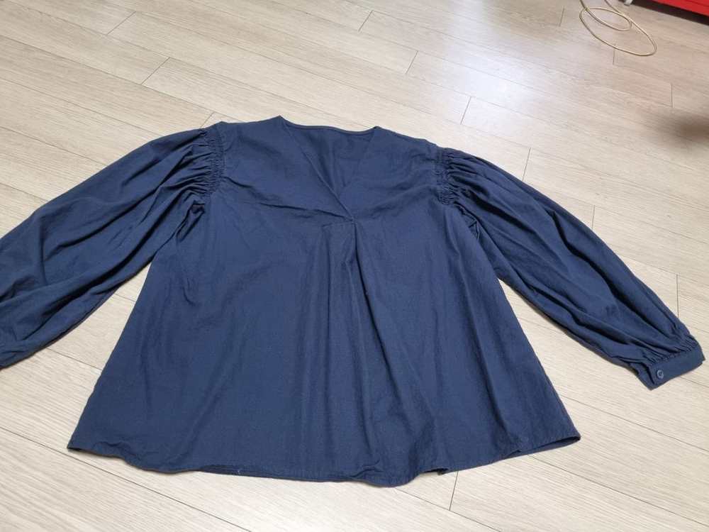 네이비 색상의 블라우스입니다 사이즈 Free (가단52 총장62) 딸아이가 2-3회 착용했음 소재는 얇은 남방면?소재같아요~