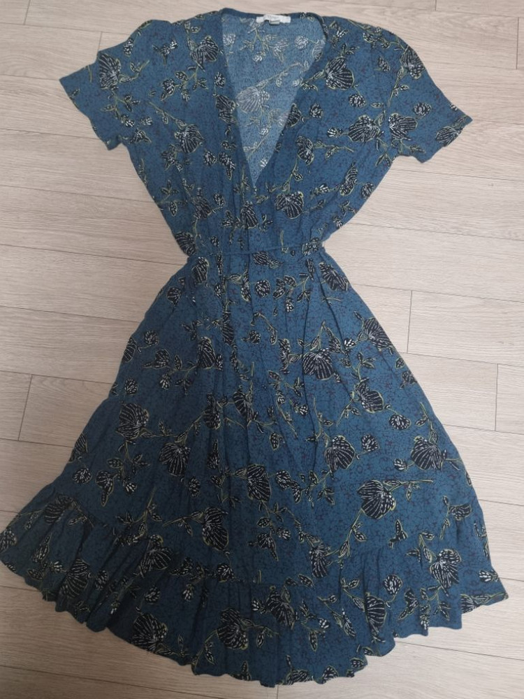 랩 스타일 원피스입니다 * 색상은 청록?색이며, 플로럴 무늬 * 사이즈 Free (가단47 총장99) 키 160기준 무릎정도 길이감 시원한소재 끈으로 조절하는 랩원피스입니다. 날씬해보이고 좋아요~