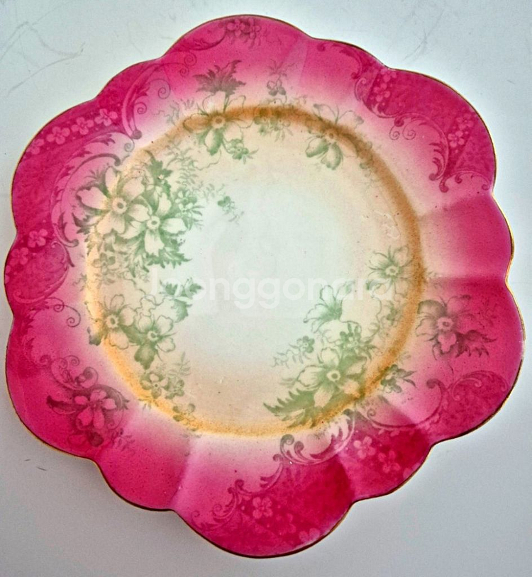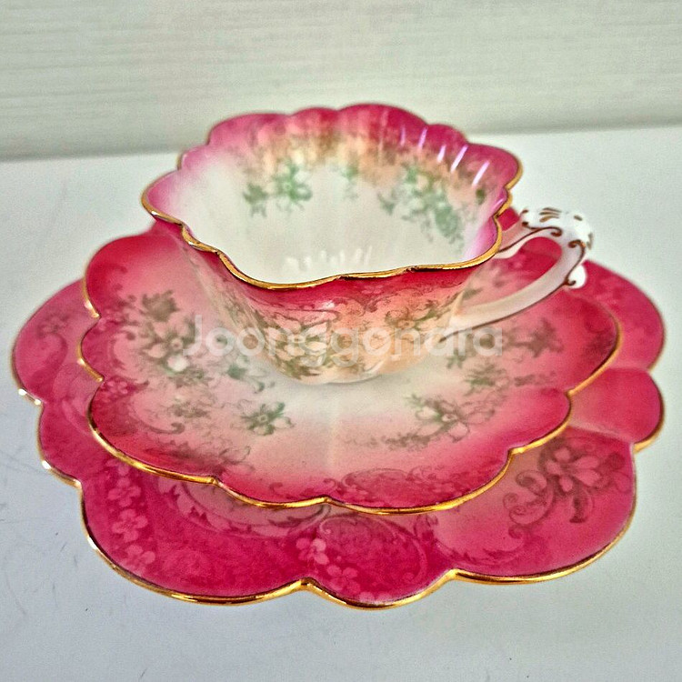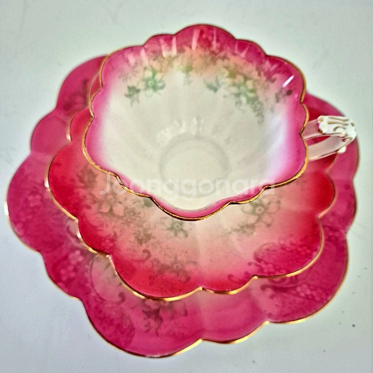 앤틱 와일만 폴리 차이나 영국에서 1892년~1910년 사이에 제작된 엠파이어 쉐입의 핑크 찻잔 소서 플레이트 트리오 세트에요. 와일만 앤 코에서 제작한 희귀한 이 앤틱 찻잔 세트는 쉘리로 알려지기 전의 것으로 폴리 차이나 라인에서 제작되었어요. 핑크와 그린 플로랄 패턴과 화려한 골드 트림이 특징으로 전사 인쇄 방식으로 제작되었으며 찻잔은 고전적인 엠파이어 형태로 우아한 곡선이 특징이며 소서와 플레이트는 독특한 데이지 형태로 디자인되었어요. 세트에는 와일만 앤 코에서 1893-1910년 사이에 사용된 선명한 백 스탬프가 있으며, 엠파이어 형태의 찻잔에는 등록 번호 Rd. 208329가 찍혀 있고, 패턴 번호 9289는 모든 아인템의 바닥면에 손으로 그려져 있습니다. 모두 2조 준비되어 있으며 전체적으로 앤틱의 특징인 세월감이 있지만 우수한 상태입니다! 크기 찻잔 지름 10cm (손잡이 포함) 높이 5cm 소서 14cm 플레이트 18cm 가격 28만원