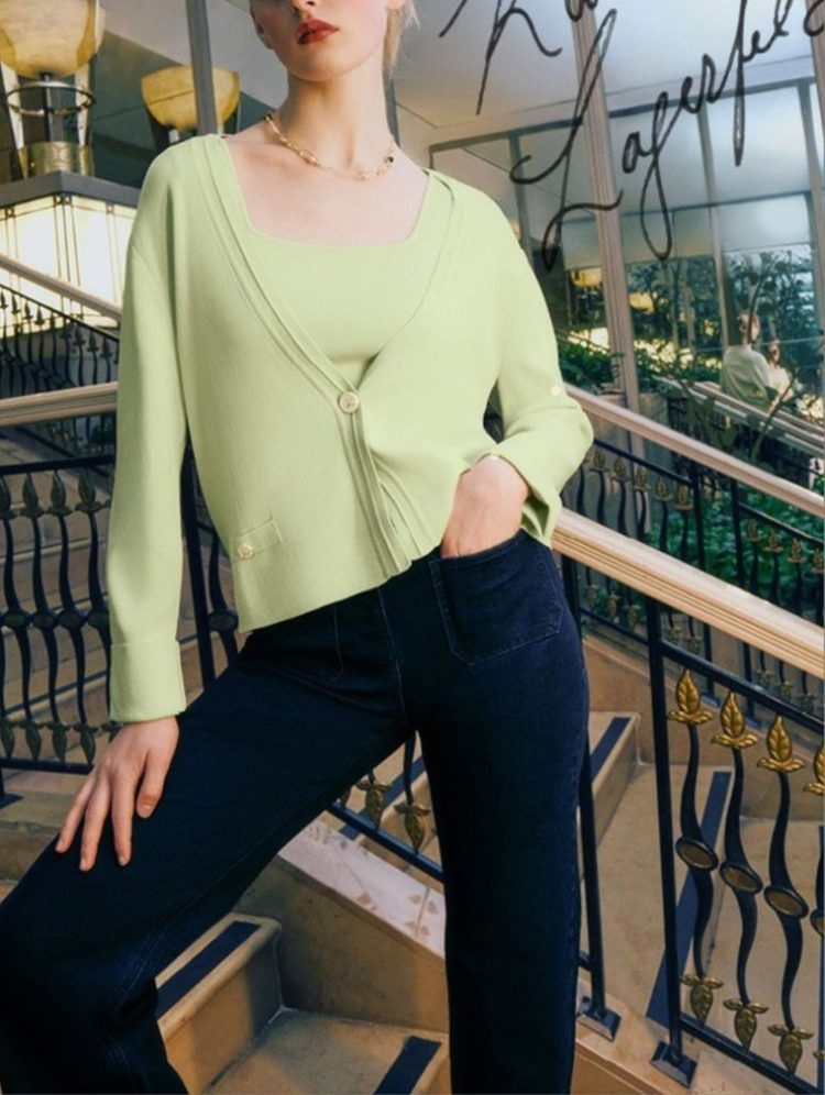🎯 GS택배 가능합니다. (일반택배 5000원, 반값택배 2500원 추가해 주세요.) 칼라거펠트(Karl Lagerfeld)의 니트탑과 니트 가디건 앙상블입니다. 그린 색상으로 77사이즈입니다. (네번째 왼쪽 사진의 색감이 실제와 가장 비슷합니다.) ㅡ 가디건 ㆍ 브이넥에 원버튼 스타일입니다. ㆍ 롤업 소매가 스타일리쉬합니다. ㆍ포켓 디테일은 페이크입니다. ㅡ 이너 니트탑 ㆍ탄탄한 조직감으로 다양하게 연출 가능합니다.