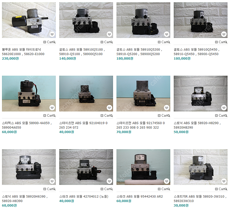 안녕하세요 수입차 국산차 순정 중고 ABS 모듈 전문 자동차중고부품 판매점 준준모터스 입니다. 하이드로릭 유니트 어셈블리 , HYDRAULIC UNIT ASSY , VDC 순정 모듈 유니트 자동차 중고부품 전문 입니다. 상품 구매 전 반드시 부품번호 호환 여부 확인 후 문의 부탁드립니다. 블루온 ABS 모듈 하이드로닉 품번 : 5862*E**** , *****-E*000 23만원 블루온 ABS 모듈 하이드로닉 5862*E**** , *****-E*000 셀토스 ABS 모듈 품번 : 5891*Q**** , *****-Q*100 14만원 셀토스 ABS 모듈 5891*Q**** , *****-Q*100 , 58900Q5100 셀토스 ABS 모듈 품번 : 5891*Q**** , *****-Q*200 , 58900Q5200 상태 확인 18만원 셀토스 ABS 모듈 5891*Q**** , *****-Q*200 , 58900Q5200 셀토스 ABS 모듈 품번 : 5891*Q**** , *****-Q*450 , 58900-Q5450 18만원 셀토스 ABS 모듈 5891*Q**** , *****-Q*450 , 58900-Q5450 스타렉스 ABS 모듈 품번 : 58900-4A050 , 589004A050 6만원 스타렉스 ABS 모듈 58900-4A050 , 589004A050 스테이츠맨 ABS 모듈 품번 : 92104*** * *** *** *72 4만원 스테이츠맨 ABS 모듈 92104*** * *** *** *72 스테이츠맨 ABS 모듈 품번 : 92174560 * *** *** *** * *** *** *** 7만원 스테이츠맨 ABS 모듈 92174560 * *** *** *** * *** *** *** 스토닉 ABS 모듈 품번 : 58920-H8290 , 58920H8290 5만원 스토닉 ABS 모듈 58920-H8290 , 58920H8290 스토닉 ABS 모듈 품번 : 58920H8390 , 58920-H8390 6만원 스토닉 ABS 모듈 58920H8390 , 58920-H8390 스파크 ABS 모듈 품번 : 42704012 기판 사용 불가 4만원 스파크 ABS 모듈 42704012 (노즐) 스파크 ABS 모듈 품번 : 95442430 AR2 6만원 스파크 ABS 모듈 95442430 AR2 스포티지R ABS 모듈 품번 : 5892*-*W*** , ******W310 3만원 스포티지R ABS 모듈 5892*-*W*** , ******W310 옵션 추가 혹은 제품 상태에 따라 가격은 변동 될 수 있으며 , 정확한 가격 상품 문의는 전화 문의 바랍니다. 진단 및 수리 장착은 하지 않습니다. 판매만 합니다 상품명 부품번호 꼭!!!! 확인해주세요. 시간이 경과 되었더라도 재고 확인 , 다른 품번 , 다른 차량 부품이 필요하시면 , 전화문의 부탁드립니다. 직거래 (화성) , 택배 , 퀵 (배송비별도) 거래 가능 합니다. 택배 배송은 파손면책 동의! 필수 입니다. 제품 상태 가격 정보 사이트 방문 (차종 , 부품번호 검색 가능) ▽▽▼▼▽▽ https://imim.kr/product/list.html?cate_no=55&sort_method=1&page=21 문의 : ***-****-**** 중고부품은 특성상 생활기스는 있습니다. 중고제품이 불량일 경우 7일 이내 동일 상품으로 교환으로 먼저 진행 합니다. 테스트용 , 개조작업 , 단순변심 , 진단오류 , 스티커 훼손 , 부품번호 미확인 주문 , 포장개봉은 반품 불가 할수 있습니다. 댓글 확인 답변은 어렵습니다. 문자 카톡 유선 문의 주세요. 감사합니다. ( 준준모터스 )상품 정보 내 개인정보는 자동 보호됩니다. 안심결제로 안전하게 거래하세요.