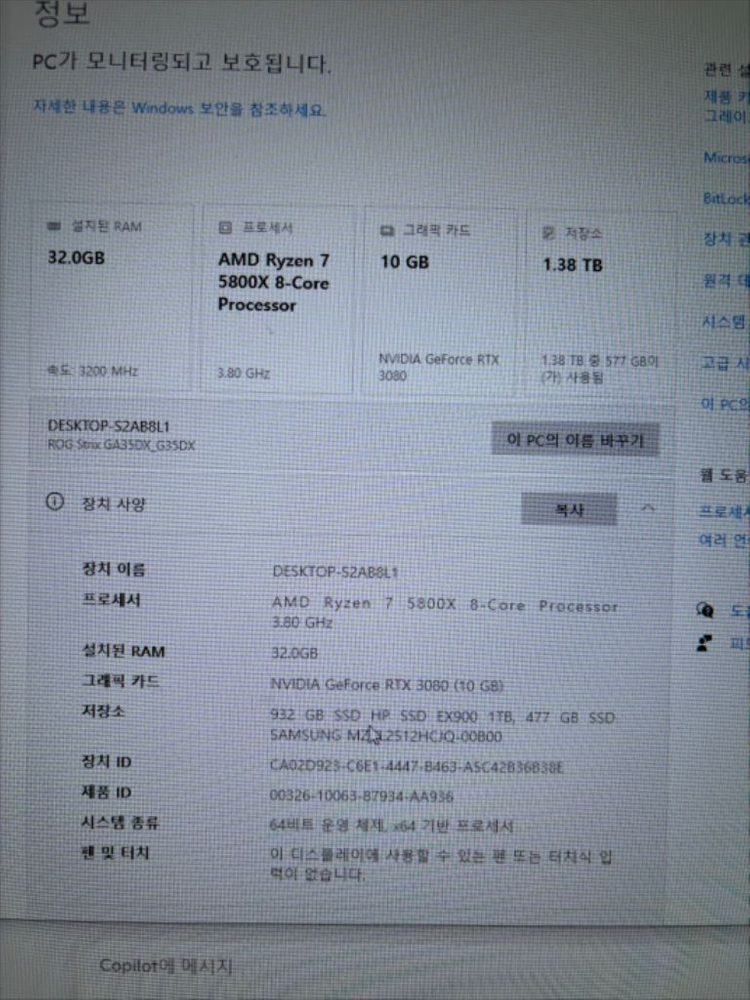 개인정보(거래정보)를 주고받는 행위는 사기에 노출될 수 있으므로 즉시 중고나라로 신고해 주세요ROG Strix 정품 PC입니다 게임 안해서 팝니다 AMD Ryzen 7 580X 8-Core Processor 32.0 GB NVIDIA GeForce RTX 3080(10GB) 1.38 TB