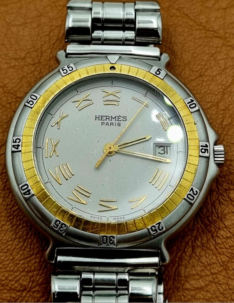 - Hermes Captain Nemo Diver 남자 시계 - 직경 36 mm 케이스 상태 매우 양호 - 밴드 폭 17.5 mm - 제 밴드 아니나 고급의 스테인리스 밴드 - 오버홀 완료 및 새 배터리 교체 - Hermes 사인 들어간 ETA 955 412 무브먼트 - 방수를 위한 나사 잠금식 용두