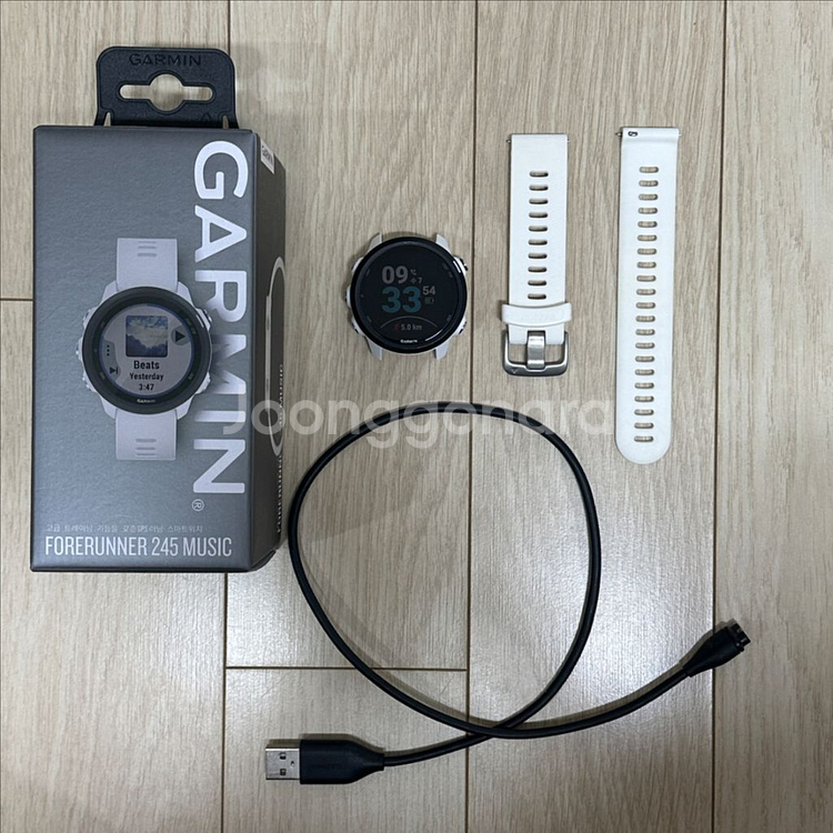 가민 포러너 245 뮤직 화이트입니다 러닝 입문용으로 이만한게 없습니다 음악재생 기능이 있어서 좋아요! 배터리 성능 좋습니다! - GPS 러닝 스마트워치 - 음악 저장 및 재생 가능 - 고급 운동 기능 지원 - Garmin Coach를 통한 맞춤형 트레이닝 플랜 제공 - 손목 심박수 측정 및 VO2 Max, 훈련 상태 확인 가능 - 배터리: 스마트워치 모드 최대 7일, GPS 모드 최대 24시간 - 50m 방수 - 무게: 38.5g - 케이스 크기: 42.3 x 42.3 x 12.2 mm 박스랑 정품 충전기 같이드려요