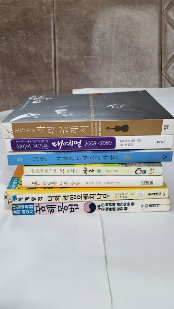 ♡ 상품설명 판매가격 1. 꿈해몽법 : 1,500원 2. 세계명작 나의라임오렌지나무 : 2,000원 3. 마당을 나온 암탉 : 2,000원 4. 한 번만 읽으면 확 잡히는 국사 : 1,500원 5. 사람은 무엇으로 사는가 : 2,000원 6. 실비아 브라운 대예언 : 2,000원 7. 조윤범의 파워 클래식 : 3,000원 7개 세트 구매시 : 9,000원 *** 필독*** * 환불, 에눌, 네고, 독촉 안됩니다. * 사진 직접 촬영 사용x , 도용x * 중고상품 입니다. * 중고 상품특성상 제 기준과 구매자님의 기준이 다를수 있습니다.민감하신분들 피해주세요. * 반택,끼택 3,000원 추가됩니다. * 배송비 4,000원 추가됩니다. * 제주 및 산간지역 6,000원 추가됩니다. * 배송시 일어나는 파손, 분실은 책임지지 않습니다. * 포장은 아주 꼼꼼하고 아낌없이 해드립니다.