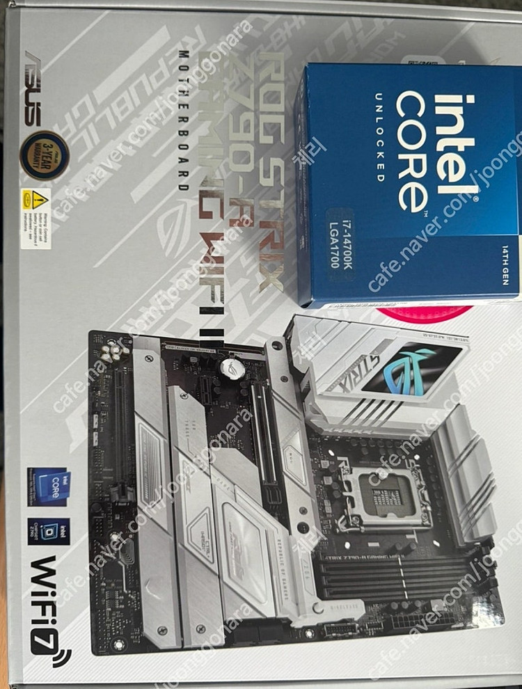 1. CPU : i7-14700k 2. Asus Rogstrix Z790-A Gaming Wifi II 3. G.SKILL DDR5-6000 CL30 RIPJAWS M5 RGB 화이트 패키지 (64GB(32Gx2)) 일괄 판매 합니다. 쿨 거래시, 네고 해드립니다.