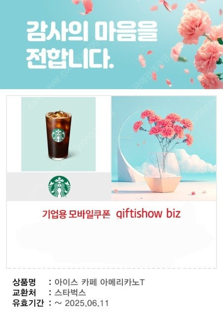 📢 제목에 "제조사/ 브랜드 명"과 "티켓명(ex. 스타벅스 아메리카노 Tall) ”을 넣어 작성하면, 보다 빠른 판매가 가능합니다! 📢 게시글 작성 시 배송 방법에 “직거래”와 “내 위치” 설정할 경우, 보다 빠른 판매가 가능합니다! 📢 내가 가진 커피, 편의점 e쿠폰을 <J쿠폰>에서 간편하고 빠르게 판매가 가능합니다! 2일 이내 판매금을 정산 받아보세요. 🚨회원님의 거래 게시글을 노린 중고나라 운영진 사칭 피싱 사이트를 주의하세요🚨 스타벅스 아이스 아메리카노 기프티콘 유효기간 6월 11일까지 중고나라 구매문의 채팅으로 문의주세용