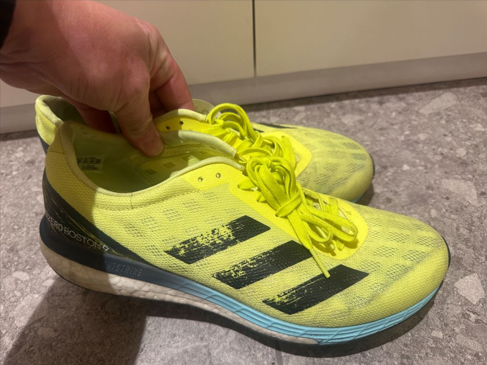 희귀템 아디다스 아디제로 보스톤9 런닝화 조깅화 운동화 신발 국내에서는 구하기 어려운 제품입니다. 밑창은 그 유명한 콘티넨털입니다. 콘티넨탈 밑창 답게 접지력 및 내구성, 내마모서으 무게 등 최고입니다. 참고로 아디다스 마크가 뭔가에 쓸린 것 같은 건, 쓸린 게 아니라 원래 디자인이 그렇게 돼 있는 겁니다. 사이즈는 285미리입니다. ADIZERO BOSTON9