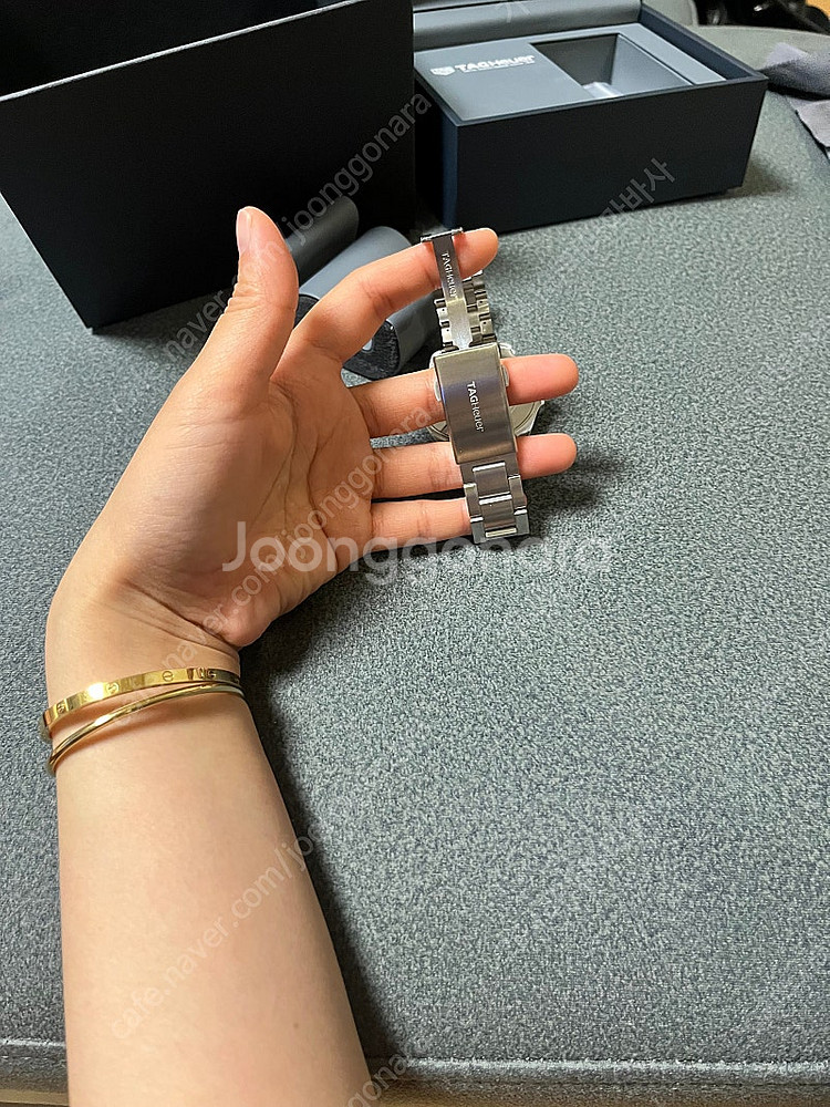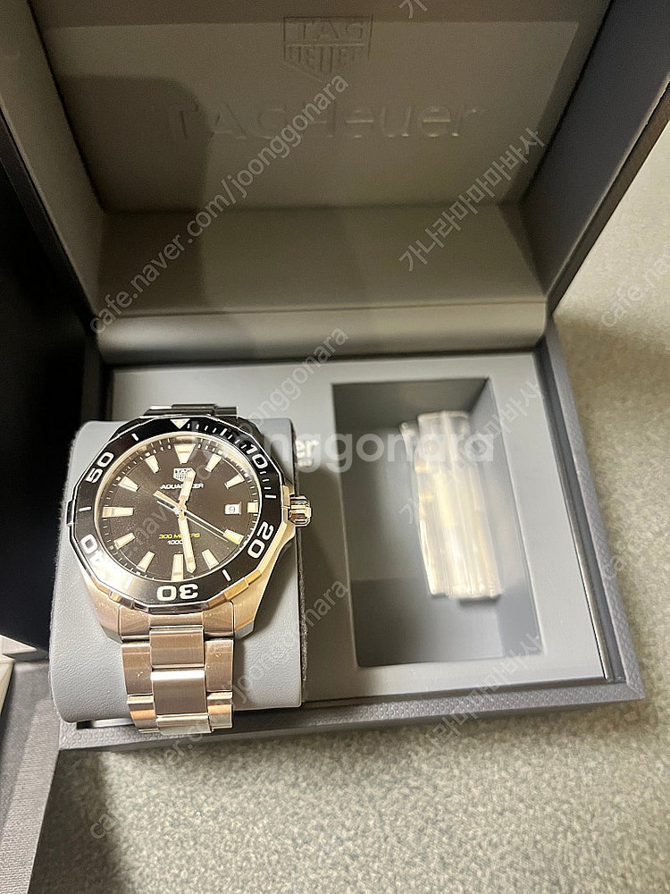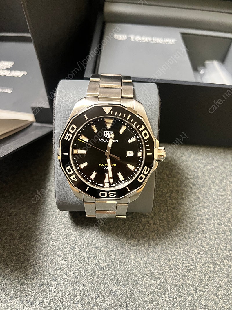 📢 제목에 "제조사/ 브랜드 명"과 "상품명”를 넣어 작성하면, 보다 빠른 판매가 가능합니다! 📢 게시글 작성 시 배송 방법에 “직거래”와 “내 위치” 설정할 경우, 보다 빠른 판매가 가능합니다! 태그호이어 아쿠아레이서 WAY101A.BA0746 검판 쿼츠 남성 메탈 시계 판매합니다.(상태양호) 모델 : WAY101A.BA0746 소재 : 스테인레스스틸 색상 : 검판 무브 : 쿼츠 규격 : 직경43mm, 두께12mm, 밴드폭20mm 유리 : 사파이어글래스 방수 : 300M(10bar) 구매처 : 신세계백화점 명보이앤씨 공식 판매처 시계상태 : 상태양호 구매가 : 300만원 시계는 출국 당시 신세계면세점 명보이앤씨 공식판매처 에서 구매하였고 줄 조정은 신세계 타임스퀘어 태그호이어 매장에서 했습니다. 구매 후 얼마 안 되어 예물을 따로 해서 실착은 4-5회 미만입니다. 큰 데미지 없고 테이프 뜯자마자 생기는 생활감 정도 입니다. 전국 백화점 태그호이어 공식 매장에서 AS가능합니다. 유리는 사파이어 크리스탈로 기스가 나지않는 유리이며 시계 케이스 및 무브먼트 정상 메탈밴드 부분도 상태 양호하고 깨끗합니다. 구성품은 시계본품, 여분코, 공식판매처 보증서, 설명서 풀구성 입니다. 시계 사진은 글 올리는 동안 찍은 실사진 입니다. 사기 방지를 위해 직거래 선호합니다. 🚨회원님의 거래 게시글을 노린 중고나라 운영진 사칭 피싱 사이트를 주의하세요🚨