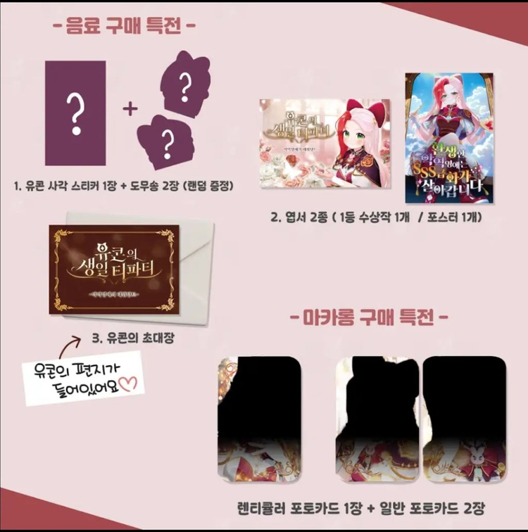 개인정보(거래정보)를 주고받는 행위는 사기에 노출될 수 있으므로 즉시 중고나라로 신고해 주세요2025 유콘 생일 콜라보 카페 굿즈 삽니다 유콘 사각 스티커 1장+도무송 2장 엽서 2종:1등 수상작+포스터 렌티큘러 포토카드 1장 &일반 포토카드 2장 유콘의 초대장 2개 다해서 8만원~10만원 삽니다