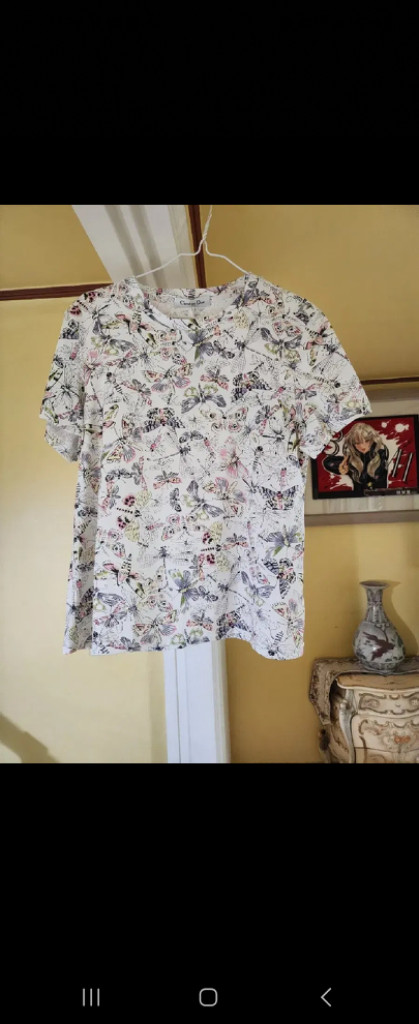 예쁜 나염무늬가 잔잔하게 여성스러운 블라우스티셔츠에요 실키한면소재 부드러워요 미듐싸이즈라 커서 바로재판매합니다66싸이즈