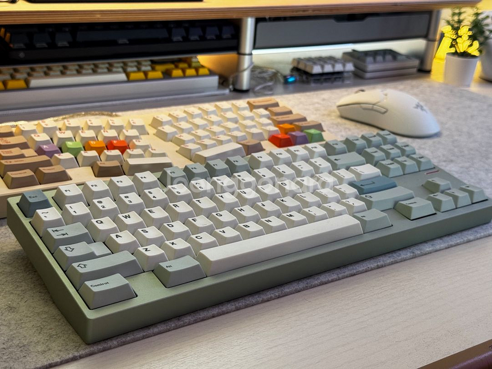 full pom빌드입니다 딸기와인스위치에 오울랩스테빌 빌드입니다 스테빌키에는 캣민트 스위치 장착되어잇습니다 핫스왑기판이며 그린색상에 wkl모델입니다 키캡은 번들 키캡입니다