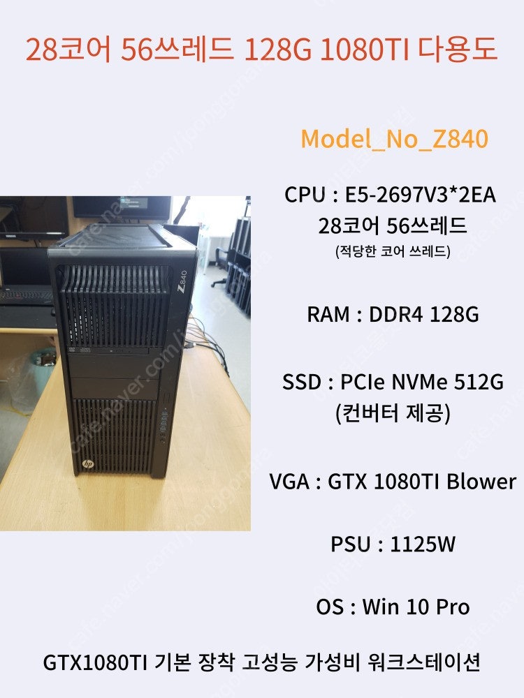 📢 제목에 "제조사/ 브랜드 명"과 "상품명(ex. 맥북 에어 13)”를 넣어 작성하면, 보다 빠른 판매가 가능합니다! 📢 게시글 작성 시 배송 방법에 “직거래”와 “내 위치” 설정할 경우, 보다 빠른 판매가 가능합니다! 1. 상품번호 : 011 중고 워크스테이션 맞춤 전문 용도와 예산에 맞는 맞춤 제작 해 드립니다. ★★★ 더 많은 상품을 보려면 아이디 클릭 -> 게시글 보기 클릭 ★★★ 2. 상품설명 가성비 좋은 GTX1080ti 까지 포함 된 완본체 입니다. 최상위 사양은 아니지만 재대로 셋팅 되어 있기 때문에 그대로 사용 하시면 됩니다. 적당한 코어와 클럭과 쓰레드 128G의 램으로 가성비 좋은 본체로 추천 드립니다. 3. 사양 Model No. HP Z840 Dual WorkStation CPU : E5-2697V3*2EA Total 28C/56T RAM : DDR4 128G STOARAGE : PCIe NVMe SSD 512G / 컨버터 포함 VGA : 1080TI BLOWER PSU : 1125W PSU OS : Win 10 Pro / Win 11 Pro 정식 설치 가능 4. 용도추천 : 저렴한 가격 준수한 성능 / GTX 1080TI 포함 완제품 5. 연락처 - mobile : ***-****-**** - e-mail : k2yo7759@naver.com - Kakao : itcomall 6. 판매가격 : 110만원 / 부가세 별도 "대표사진 입니다." 7. 옵션 선택 (이메일로 견적서 요청 가능 / k2yo7759@naver.com) * SSD 변경 : 1T로 변경 / 추가 가능 * HDD 추가 : 2T /4T /6T 8T/ 10T/ 12T/ 14T / 16T /18T / 20T * VGA 추가 : 화면출력용 / RTX A****/****/**** / RTX 4090 Blower / RTX Quardro 8. 구매방법 *...상품 정보 내 개인정보는 자동 보호됩니다. 안심결제로 안전하게 거래하세요.