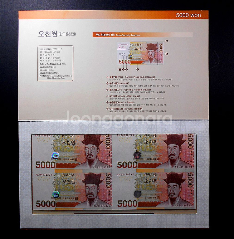 한국은행 2022년 5차 5,000원 완전미사용 지폐 4매 오천원 연결권 지폐첩 ※ 매매상담환영 : 010-7514-4349 신뢰와 전통의 취미화폐사는 화폐상담을 환영하며 고가매입도 해드립니다. 취미화폐사는 조선은행 한국은행의 모든 지폐와 주화 및 금화 은화 동화 등 기념주화 민트세트와 우표 우표책 우표앨범 그리고 미국 일본 유럽 아시아 등 외국화폐와 주나라 송나라 청나라의 고전과 고려시대의 삼한통보 동국통보 조선시대의 조선통보 상평통보 대한제국의 은화 및 청동화 등 모든 지폐와 주화 및 우표 등을 고가에 매입하고 저렴하게 판매하며 정확한 감정을 해드리고 있으며 100% 진품만을 취급합니다. 구매하신 상품은 훼손방지를 위하여 홀더와 마운트에 정성껏 넣어서 드립니다. 여러건 구매시 묶음배송하므로 1건만 선결제하시면 우체국 택배로 익일에 도착합니다. 취미화폐사로 검색하시고 언제든지 매매상담하세요~! 감사합니다.