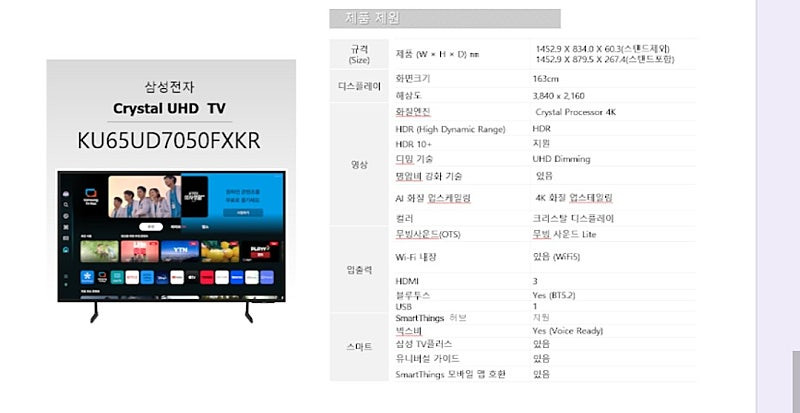 올 6월에 새아파트 입주예정자 입니다. 조합원이다 보니 조합원 무상제공 제품이 있어 매물로 내놓게 되었습니다. (1대 850,000원도 구입 가능) 계약하고 거래하시면 삼성에서 제작에 들어가고 2~3주 후 원하는 날짜와 주소에 배달됩니다. 벽걸이 설치를 원하시면 대당 10만원 추가하시면 배송업체에서 설치해 줍니다. 티비(TV) 65인치 모델명: 삼성 KU65UD7050FXKR 시중가 : 96만원 https://search.shopping.naver.com/catalog/54769812737?cat_id=50002114&frm=NVSCPRO&query=%EC%82%BC%EC%84%B1+KU65UD7050FXKR&nl-ts-pid=jvQGwdqosTCssTHd5sKssssstXh-189036&NaPm=ct%3Dmb8yzzeg%7Cci%3D49a834318591918035851397a57dc556b72ecdb9%7Ctr%3Dsls%7Csn%3D95694%7Chk%3D975e86338195ff9f25ac92d8b99867c422ddc049
