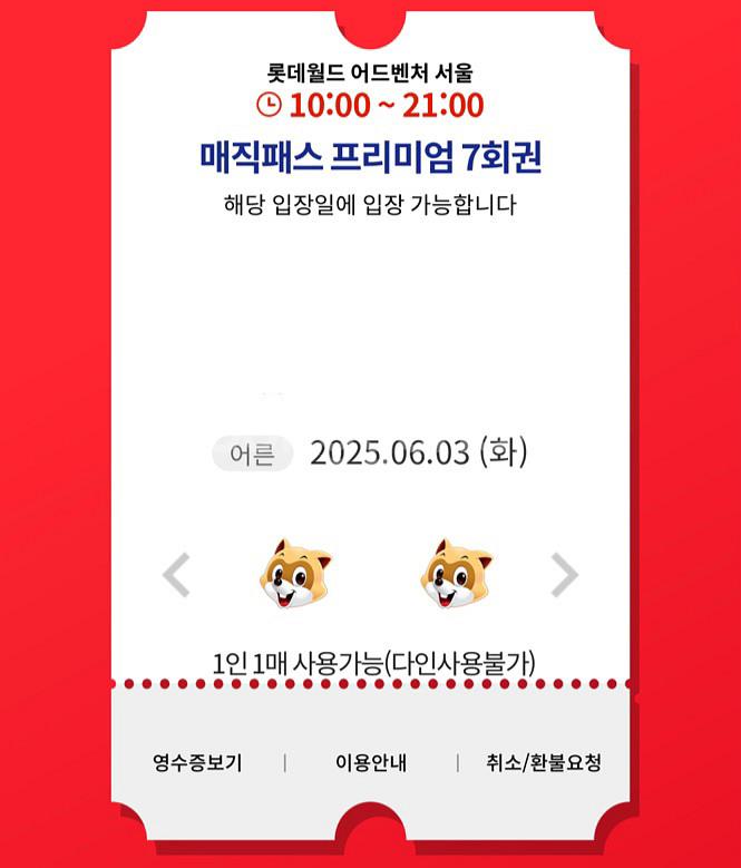 낱장도 당연히 가능합니다⭕️ 롯데월드 매직패스 5회권 -양도완료- 7회권 2장 (1인 95,000원) 핸드폰 번호로 선물하기로 즉시 발송 해드립니다 당일 날 보내준다고 하는건 다 사기이며 저처럼 매직패스 당일 날짜 사진 인증 없으면 사기입니다. 거래내역 많습니다.