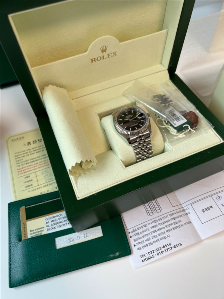 롤렉스 데이트저스트 36mm 검판 바 플루쥬빌 룰렛데이트 116234 판매합니다 case : 36mm height : 11.6mm lug to lug : 44.5mm lug : 20mm 3135 무브, 48시간 파워리저브 / 핵기능, 수동감기 지원 100m 방수 ​ 14.11 국내 스탬핑 / 19.11 구구스 미사용 신품 구매(전 판매자) / 본인 2차 구매 후, 24.7 사설 오버홀 (폴리싱X) 부속품 : 여분코(풀코) 박스 개런티카드, 씰, 책자, 쇼핑백 기타 구매 오버홀 증서, 종이박스는 이염있습니다. 실착용 했으나, 기간 대비 컨디션 괜찮고 줄 늘어짐 없습니다. 고가라 직거래 하실테니, 실제로 보고 확인하시기 바랍니다. 룰렛데이트는 짝수날은 검정 날짜창, 홀수날은 빨간 날짜창으로 매력있습니다. 데이트저스트 검판 플루쥬빌, 인기모델이라 네고 요청은 정중히 사양하겠습니다. 직거래 예약금 30만원 받겠습니다(노쇼방지). 사전 연락하셔서 캔슬하셔도 30만원 돌려 드리고, 만난 후 구매 안하셔도 30만원 돌려드립니다. 말 그대로 노쇼 방지입니다. 상호 신분증 확인, 본인 명의 계좌이체만 합니다. 직거래 대구 범어역 인근(상시) 예약금 받은 후, 주요 ktx역 이동가능 (수요일) 서울 명동 / 서울 신사 / 부산 시계거래소 거래가능(수요일) 010-593I-78Ol 안전번호로 연락 주세요. 감사합니다.
